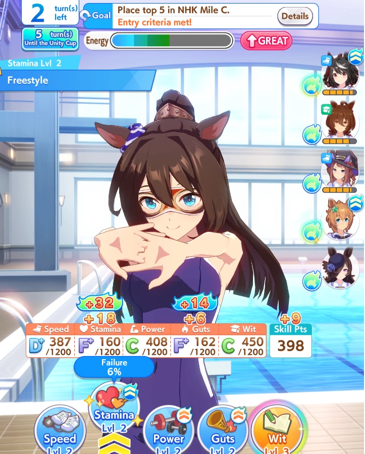 Guts cards are bizarre in that way. Some of them (Urara/Mambo/Doto) have several energy + mood up events, while others (Groovy/Palmer/Ines) have energy sapping events. It isn't clear at all what they were going for there. I guess mix 'n match the sappers with the juicers.