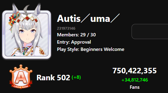 You must be E3 (20k points) to join a circle. Apply with /uma/ or /vg/ in your profile or post ID in the thread.
