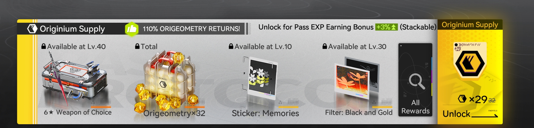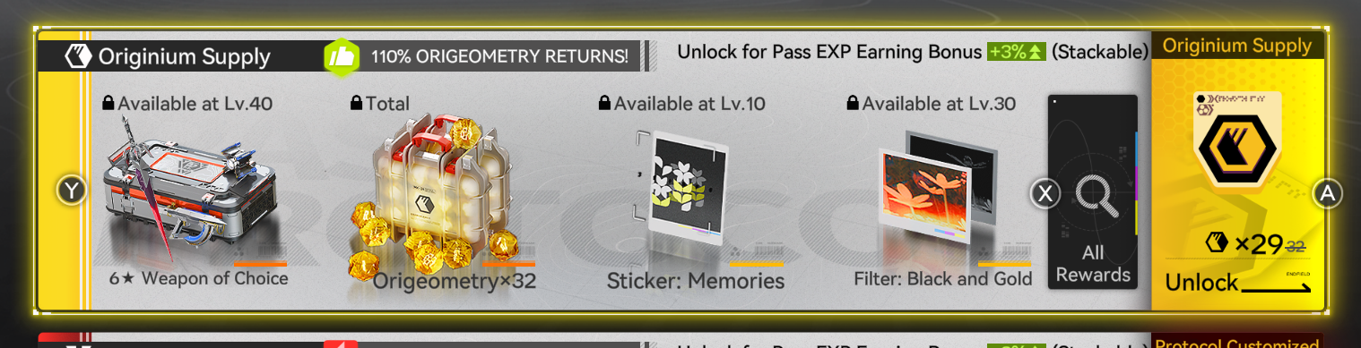 >>555028891>Is this like those level packs you get when you reach a certain level in Arknights?It's a battle pass. You buy it once for 29 origeometry, and if you complete it, you get 32 origeometry back so you can buy it again. It's technically free.