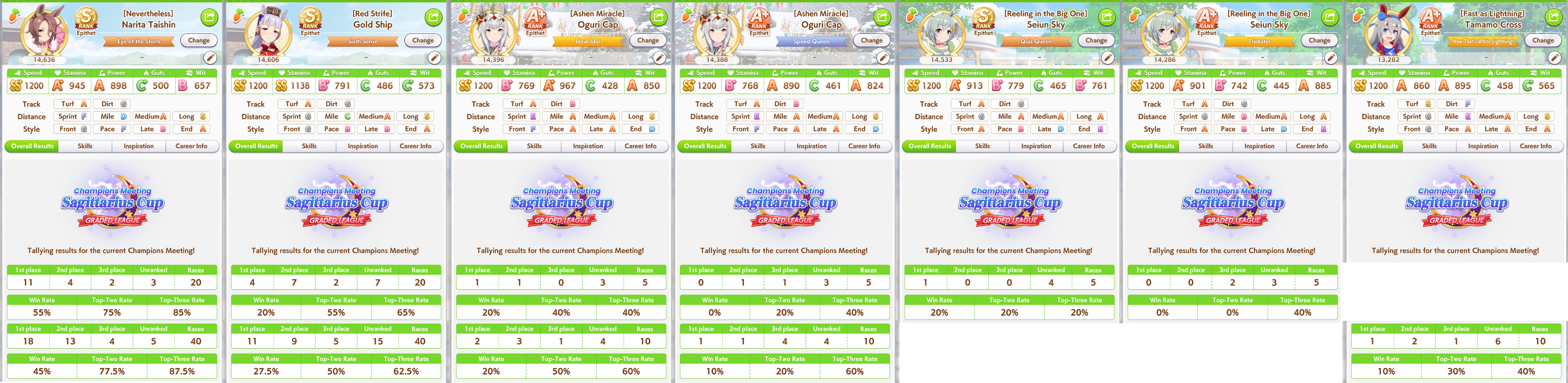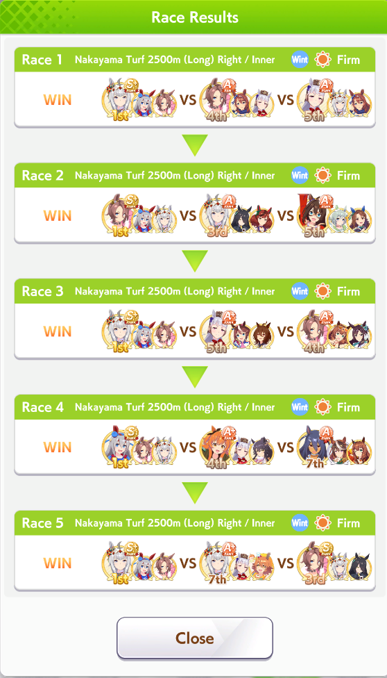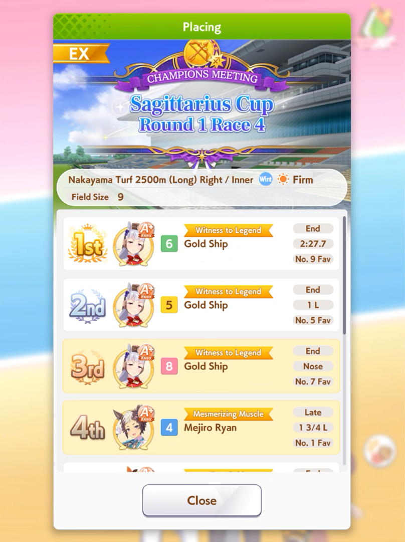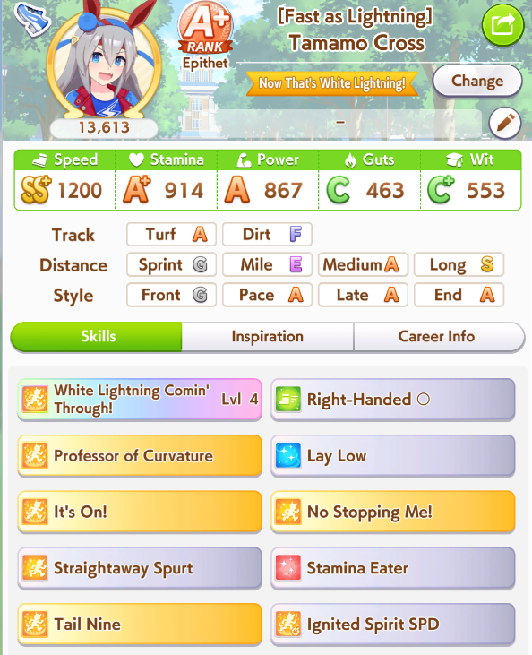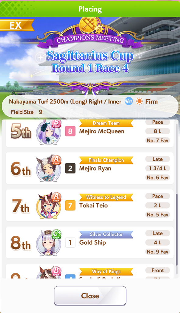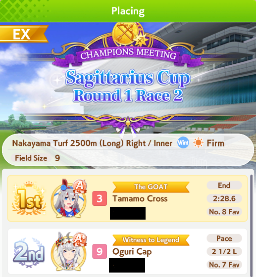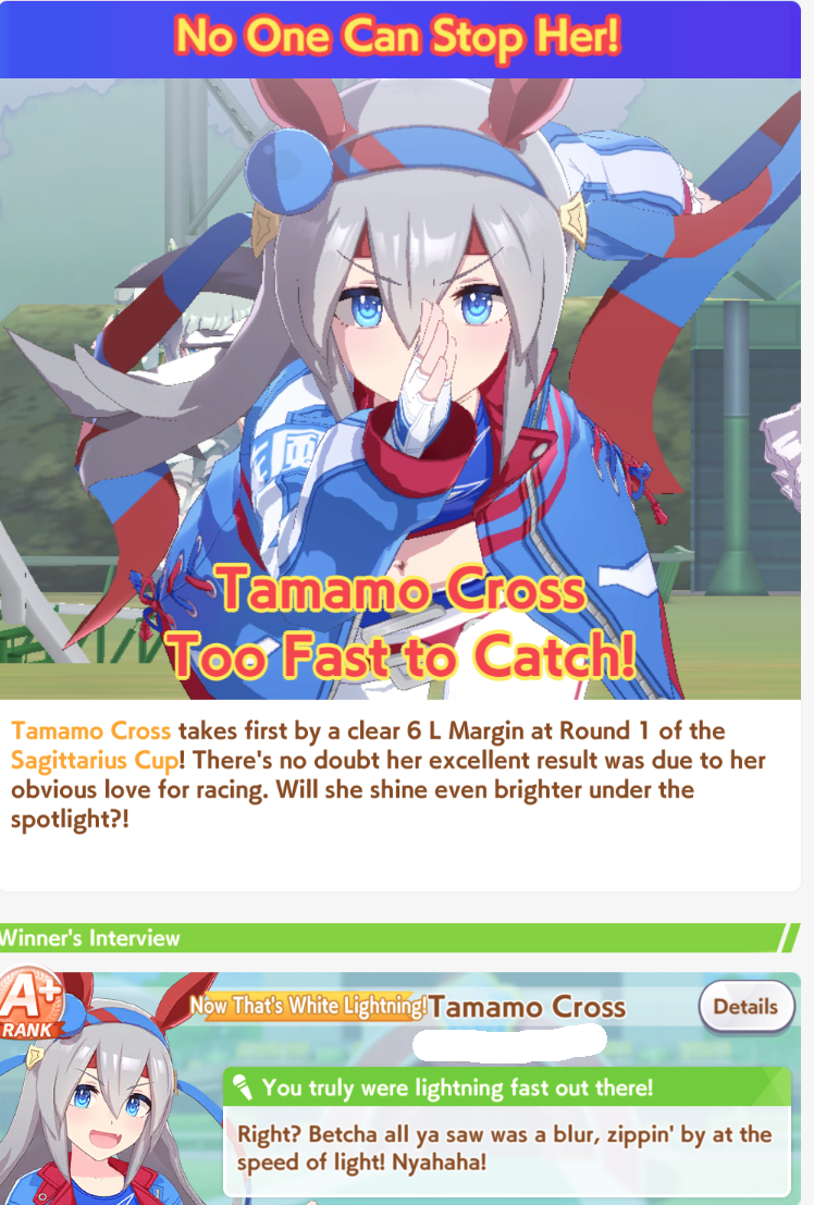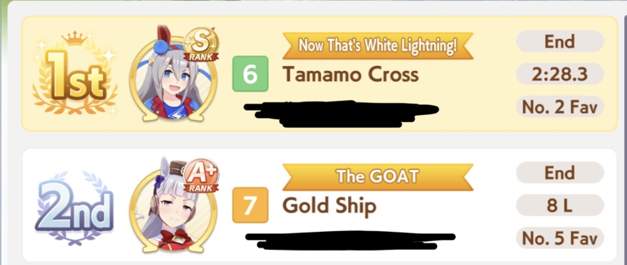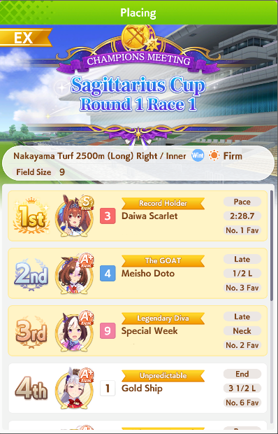 POST EMTaishin and Golshi are carrying as usual, with Golshi picking up a few more cleanup wins when Taishin fumbles. Trying out this Tama, testing the Oguris again, and dropped the Seiuns. Pace promoted Oguri is hard to beat, but I think I'll keep cranking out Tama careers in case I high roll her.