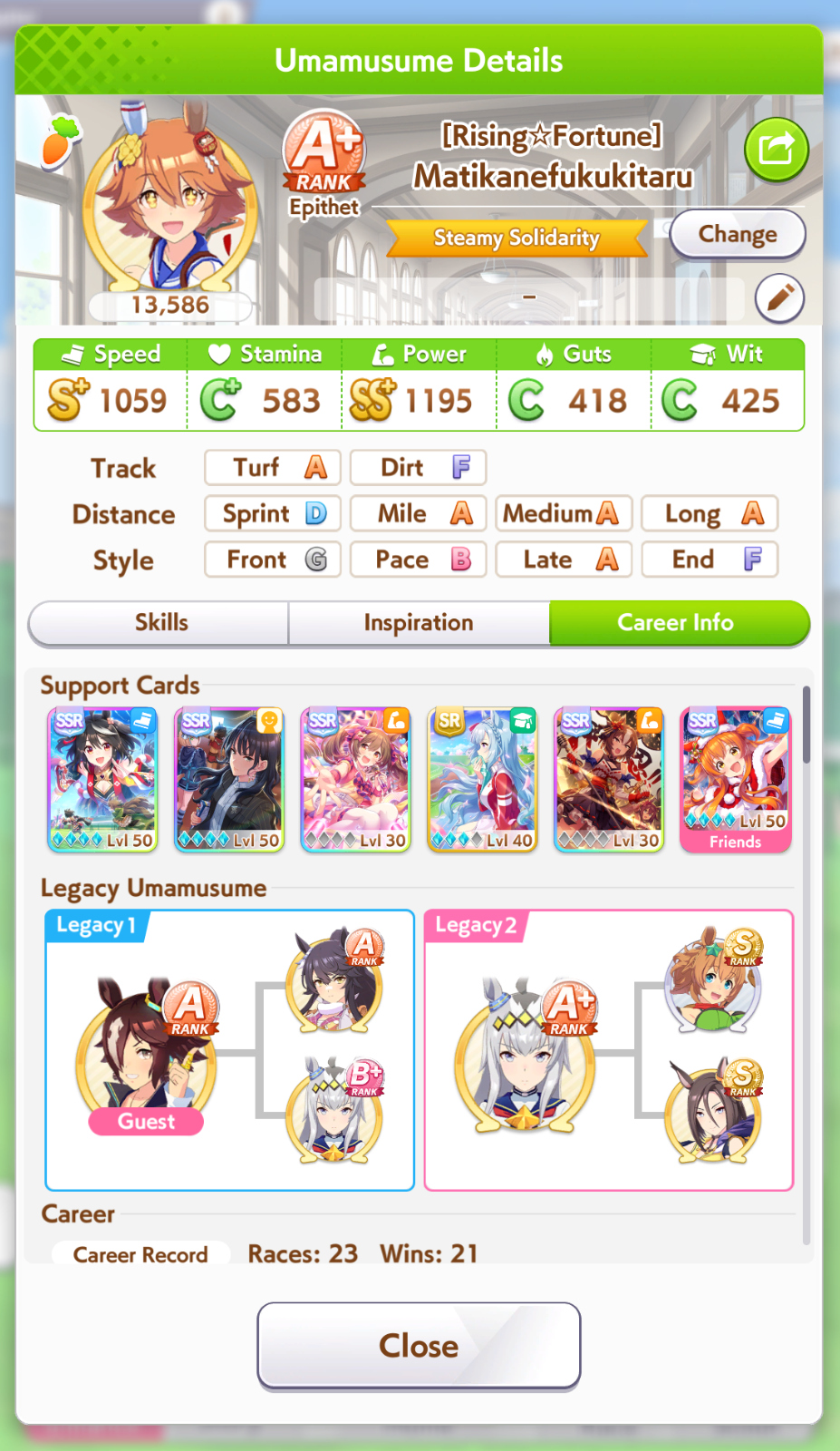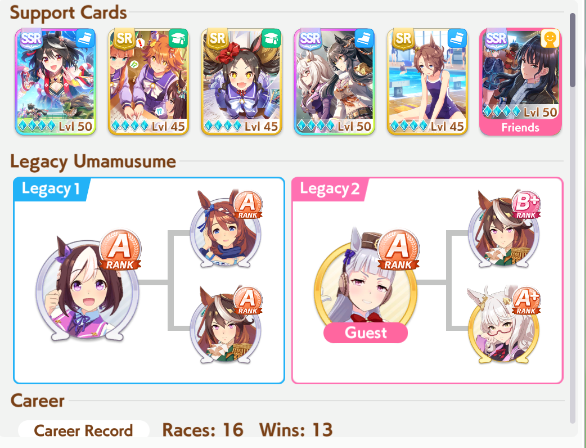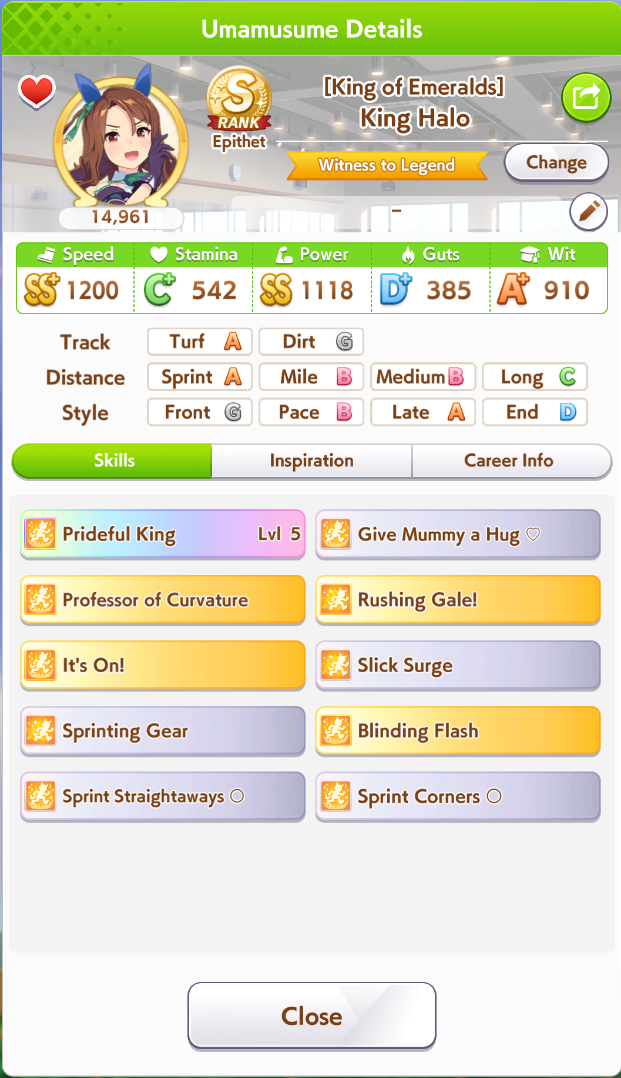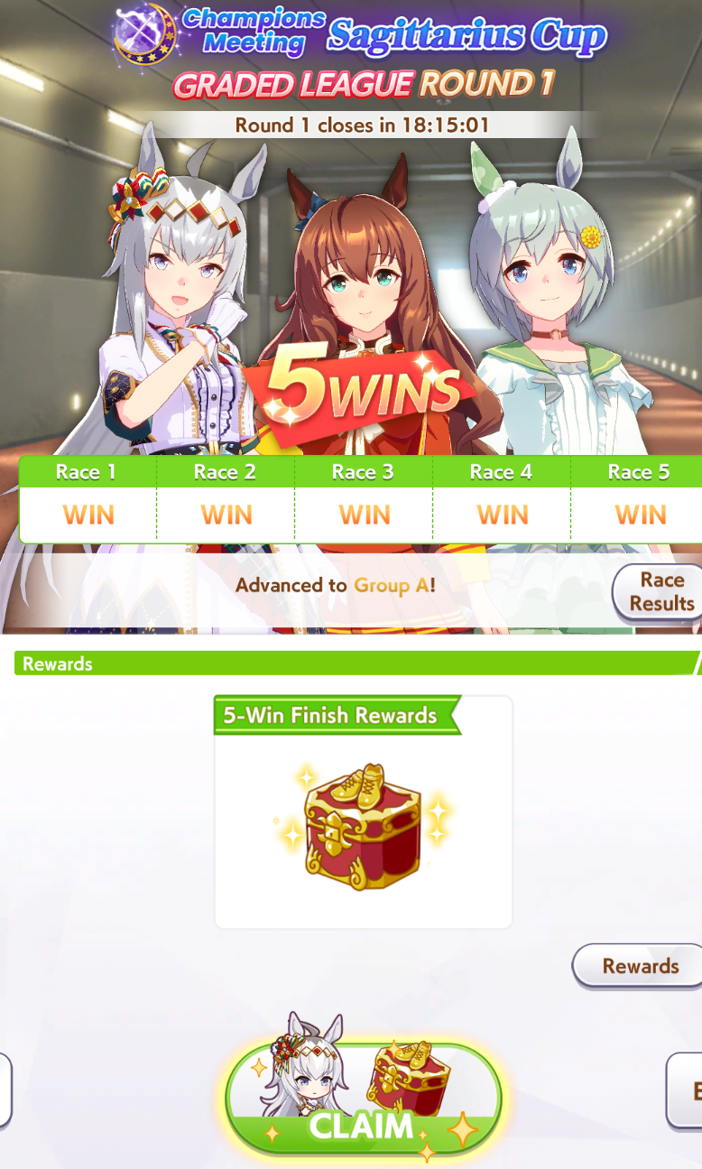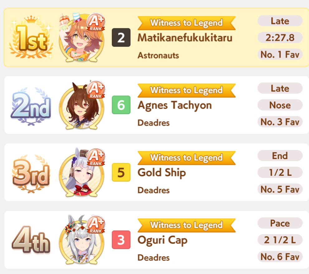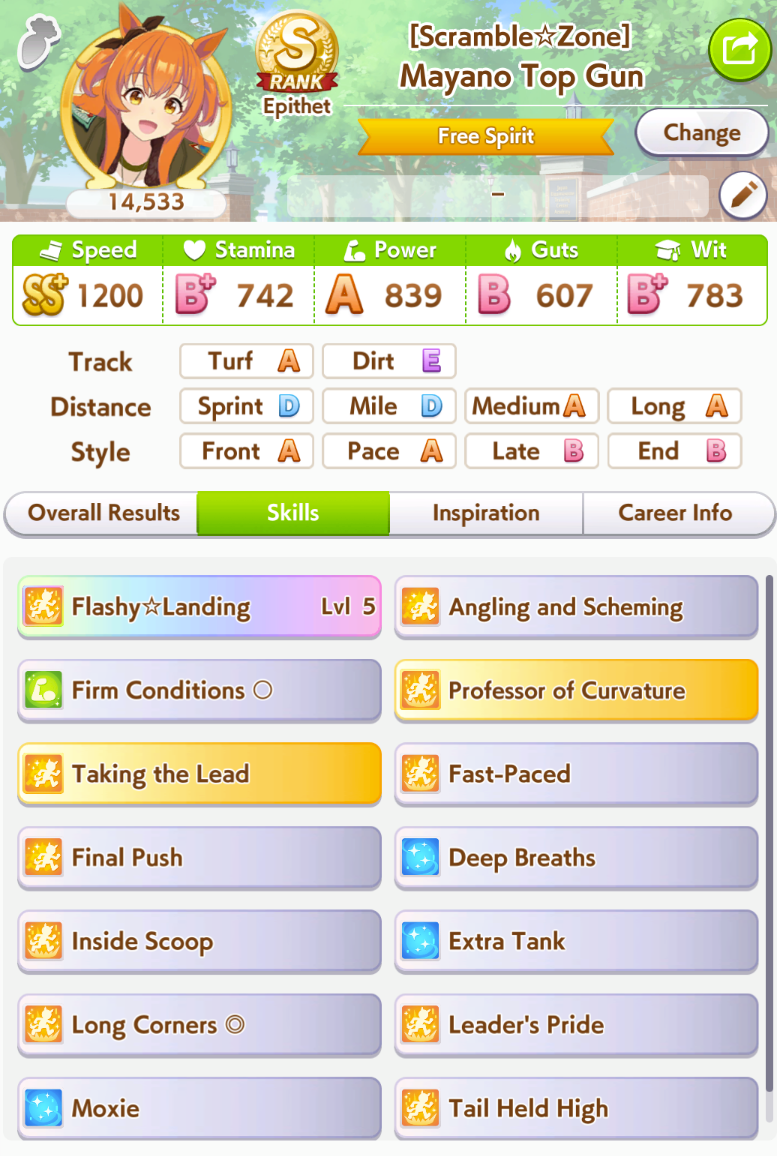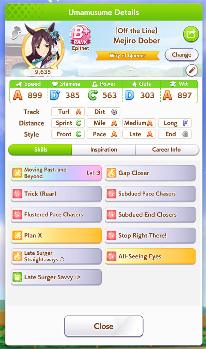 POST EMTaishin and Golshi are carrying as usual, with Golshi picking up a few more cleanup wins when Taishin fumbles. Trying out this Tama, testing the Oguris again, and dropped the Seiuns. Pace promoted Oguri is hard to beat, but I think I'll keep cranking out Tama careers in case I high roll her.