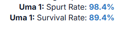 >>555068248Survival rate is whether you'll run out of HP before the goal and spurt rate is whether your uma will start accelerating at the last spurt IS what I understood from using it