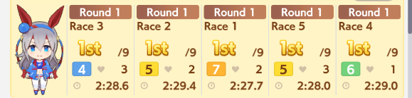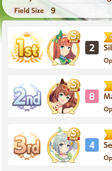 >>555066989Doing way better than yesterday, Opera O clutching some wins too. Suzuka sometimes falls too early (sometimes she falls so fast that she gives the pace free NSM instead) so I'll try a stronger Suzu next round
