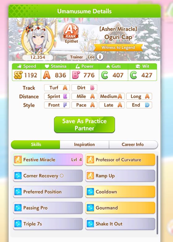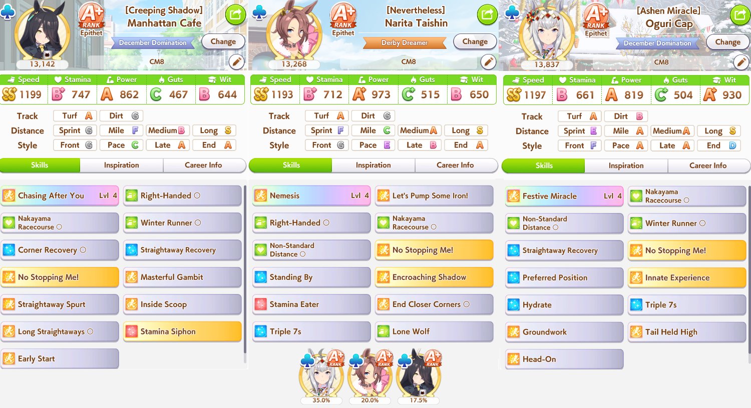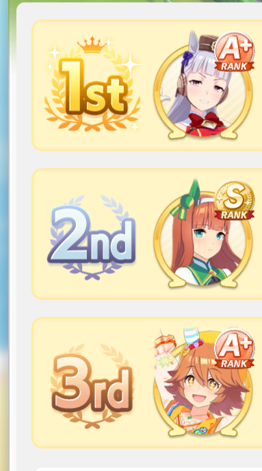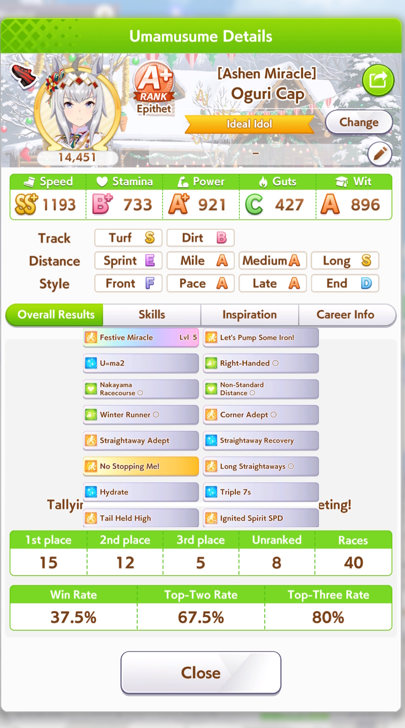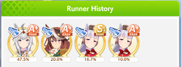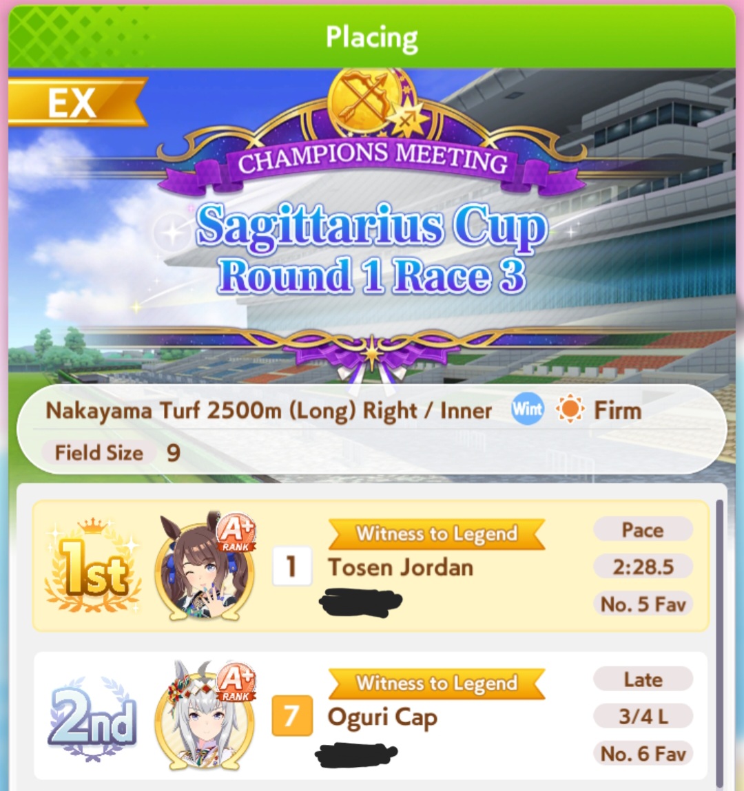 >>555087334My Oguri is the first and only S Uma I managed to get so far (though A+ is pretty standard now)If she activates her ult and/or gets pace promoted she tends to winRest of my Long S Umas are Lates (Rudolf, Dober, Air Groove) who are apparently bad this CM and they've definitely won less, but still clutch sometimes