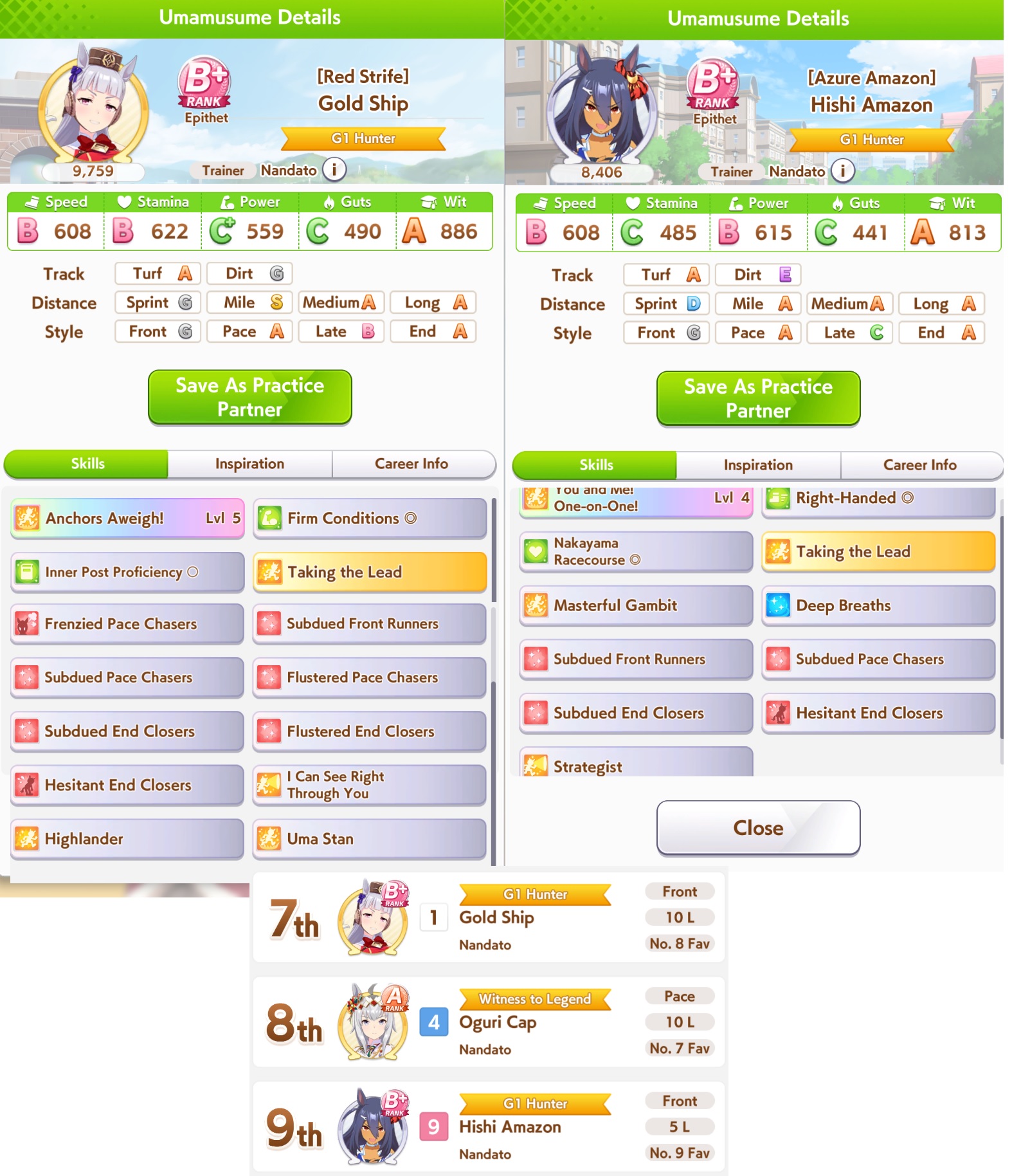 >>55508766911 but I will exchange with either Tact or Almond Eye so they can yap awayOr 1 since Ramonu isn't interested in anything that isn't racingShould be good spots to sleep