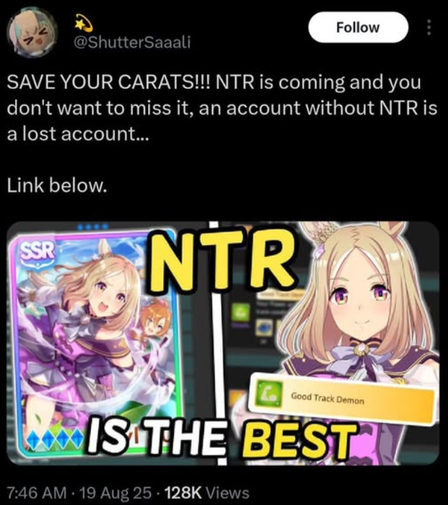 Previous: >>555044075>Global Game NewsLink your account to Cygames iDCurrent Scenario: Aoharu Hai aka "Unity Cup"Current Rate Up Trainee: Fine Motion (3*), Tamamo Cross (3*)Current Rate Up Support Cards: Manhattan Cafe (SSR), Inari One (SR), Nice Nature (SSR), Oguri Cap (as in peak SSR)Current CM: Sagittarius Cup - Nakayama Turf 2500mMain Story Chapter 5 is out01/27 - New Beginnings Part 101/29 - NY Opera & Haru 3*+Fuku SSR+Ayabe SSRMid February - Capricorn Cup - Chukyo Turf 1200mhttps://umamusume.com/news/100040/https://pages.snep.pw/uma/anni-skill-changes/>JP Game NewsCurrent Rate Up: Kiseki (3*), Support Card Select Pick UpNew Scenario "Yukoma Hot Spring" releasedTimeline: https://uma.moe/timelineCygames Webstore: https://webstore.cygames.com/en/umamusume_en/>Thread Clubshttps://rentry.co/umaglobalclublistYou must be E3 (20k points) to join a circle. Apply with /uma/ or /vg/ in your profile or post ID in the thread.>All Guides & Resourceshttps://rentry.org/uma26Game databasehttps://gametora.com/umamusume (Click the gear to switch between JP / global server info)A basic guide for newfagshttps://rentry.org/umaglobalFind networks if your region is blocked from the game or clienthttps://www.umavpn.top/93Seiyuu & Concertshttps://rentry.org/umstUma Texthttps://umareader.idsmile.xyz/