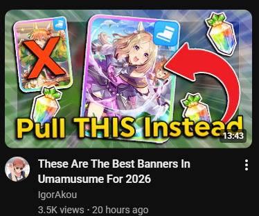 >>555086754you're talking about tourists, shills and gaslighters bwo. Most of actual /uma/ players despise 'guide makers'. Witgod is the only one that gets even a little respect and plenty still think hes a joke too. (el pace promote lul)
