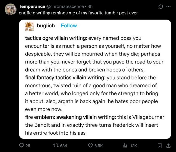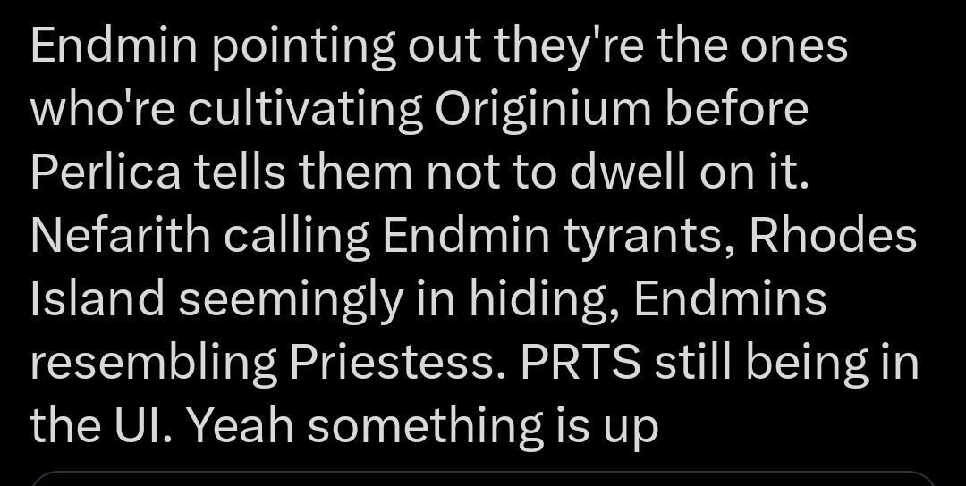 >AK (base)morals of the doctor and rhodes island as a whole are often brought into question as the doctor's claim of being impartial becomes more and more of a lie>endfieldthe endmin does straight up cartoonishly evil things like bringing originium to new planets and selling its inhabitants the cure, yet we are glazed as the good guys for doing this. the only people who oppose us are literal savages that can't even read or write correctly even though they were indigenous to the valleydoes this get any better once we get into the 2nd world because good lord what is going on