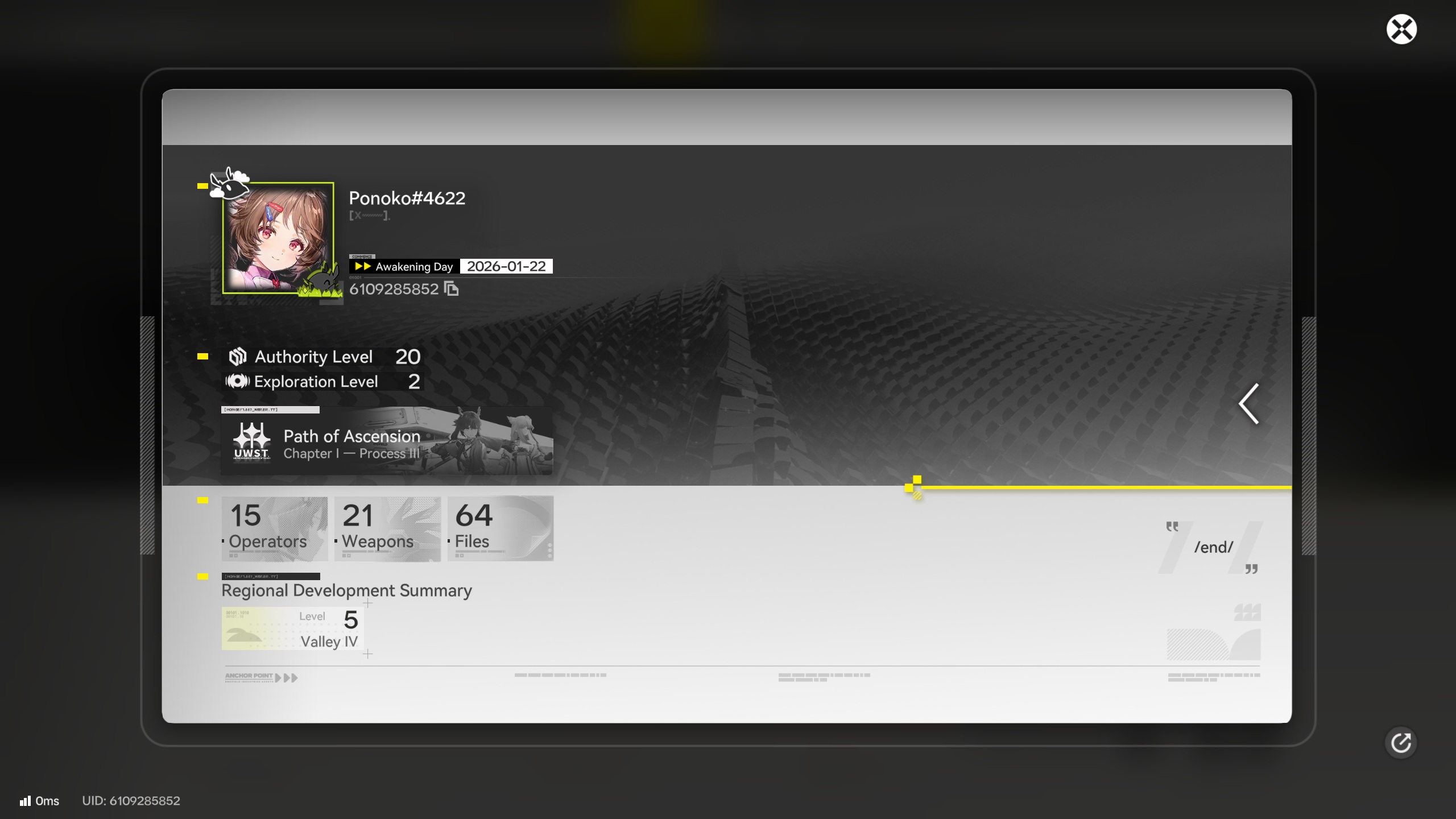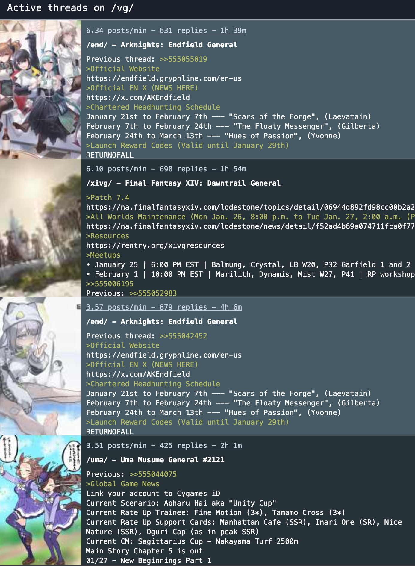 Previous thread: >>555055019>Official Websitehttps://endfield.gryphline.com/en-us>Official EN X (NEWS HERE)https://x.com/AKEndfield>Chartered Headhunting ScheduleJanuary 21st to February 7th --- "Scars of the Forge", (Laevatain)February 7th to February 24th --- "The Floaty Messenger", (Gilberta)February 24th to March 13th --- "Hues of Passion", (Yvonne)>Launch Reward Codes (Valid until January 29th)RETURNOFALLALLFIELDENDFIELDGIFTENDFIELD4PC>Voyage to the Stars (Ongoing until March 4th)https://endfield.gryphline.com/activity/voyage-to-the-stars/en-us/>Special Launch Streamhttps://www.youtube.com/watch?v=dz2g_D52NR0>Official Release Trailerhttps://www.youtube.com/watch?v=oJ00ggFb8A0>Official Release PV'shttps://www.youtube.com/watch?v=5Xm45NwWOlohttps://www.youtube.com/watch?v=UPpeeft1-8ohttps://www.youtube.com/watch?v=tN80M6IEMo0>Wikishttps://wiki.skport.com/endfield (Official)https://perlica.moehttps://warfarin.wiki/enhttps://endfield.wiki.gg/>Blueprint Guideshttps://talospioneers.com/en>Stickershttps://drive.google.com/drive/folders/13KH3L6QPIKkVH7pBddv4uxwmwJsnOtklhttps://drive.google.com/drive/folders/1OuVtjv1k-9c3M6n7d4PX3CGG5bkwH04ahttps://drive.google.com/drive/folders/1AStB8bzFk3lSwMwczWPkFYCBrZe0vHOghttps://drive.google.com/drive/folders/1yS0lqUhxf8tBRtpDFfCU1y16IS2sSeF7
