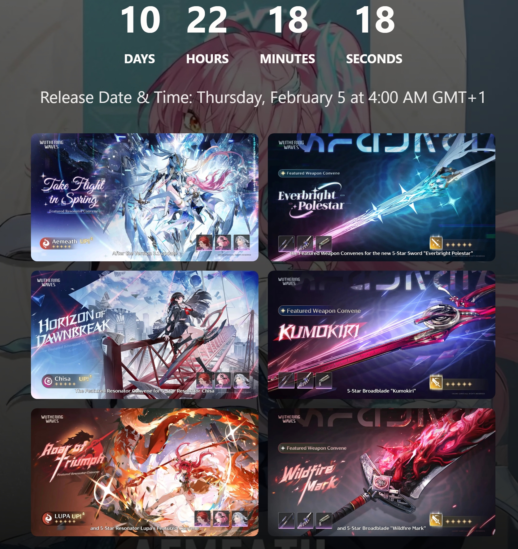 Download (Android/iOS/EGS/Windows)https://wutheringwaves.kurogames.com/en/#mainhttps://store.steampowered.com/app/3513350/Wuthering_Waves/>Wuthering Waves Version 3.1 Preview Special Broadcasthttps://www.youtube.com/watch?v=8hRuboBwb9g>Wuthering Waves Cinematic Short | Salvationhttps://youtu.be/TnXzZxKmGYk>Version 3.1 exclusive first look at Aemeathhttps://x.com/i/status/2009452329528119466>Wuthering Waves Story Cinematics | Originhttps://youtu.be/DXRqVumTFh4>Wuthering Waves | Resonator Showcase | Mornye — VERY FIRST STARhttps://youtu.be/ziAGnHy-gUQ>Wuthering Waves Resonator Combat Showcase | Mornyehttps://youtu.be/Hr6ltK-p4pg>Wuthering Waves Version 3.0 Official Trailer | We Who See the Starshttps://youtu.be/1Lr41l-eJUw>Map:https://wuthering-waves-map.appsample.com/>Convene Trackerhttps://wuwatracker.com>EventsWHEN IN DOUBT, CHECK: https://wuwatracker.com/timeline[Signs of a Silent Star Leisure Event] [21 Jan - 03 Feb][Startorch Racing Leisure Event] [14 Jan - 03 Feb][Let's Go, to Startorch Academy!] [25 Dec - 04 Feb][Peaks of Prestige: Rekindled Duel Echo Combat Event] [25 Dec - 03 Feb][Persona Sonic Collab Event] [25 Dec - 03 Feb]>Timeline, Rewards and Media Contentshttps://rentry.org/wuwavgv2>Emoteshttps://drive.google.com/drive/folders/1GY6YgPhhOsxN2oW0AbIywdO9Z1_OFe6Khttps://files.catbox.moe/49buge.zip>/wuwa/ Friends Listhttps://docs.google.com/spreadsheets/d/1MzulbsusjOWpaFg6o6kk3TvCWfFYi6EF7NyJXqIazGo>NEWS/EVENTS (and patch notes)https://wutheringwaves.kurogames.com/en/main/news/detail/4082>CODESPAPERPLANEJOURNEYWELLWARMSUNLIGHTPrevious: >>555012919