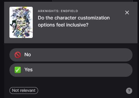 >>555083847Just put it in the survey like I did and hopefully the devs will listen. To be honest, as long as there is no companion quest there will be not much pandering. Companion quests should work just like bond events in other games. Canon but optional.