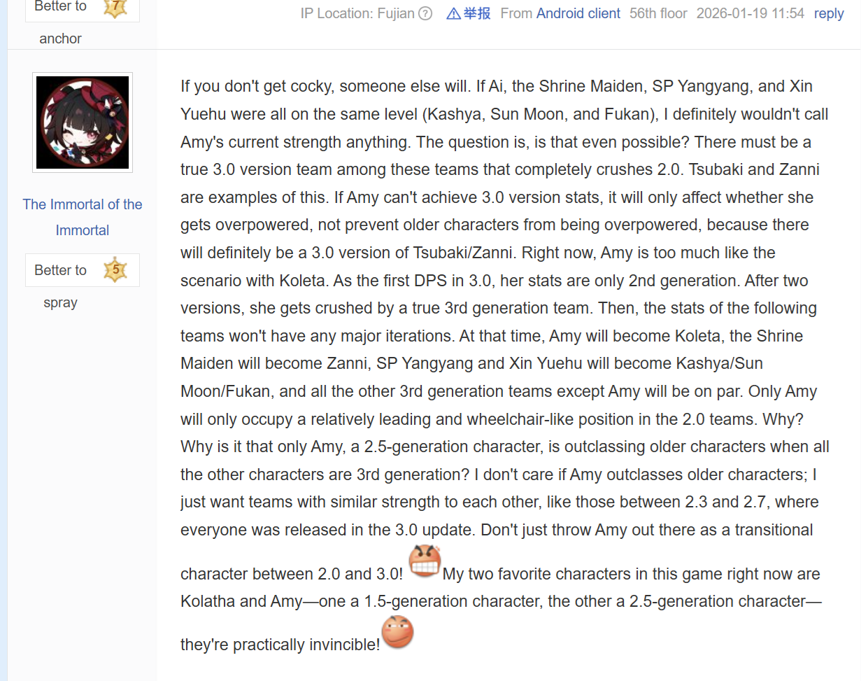 https://tieba.baidu.com/p/10427201479leaker with a good track record describes what is currently going on at kuro>a majority of "leakers" are paid and information is leaked on purpose>the technical team is ahead of the curve, but the game isn't able to keep pace with them because the other departments are behind. Dorms are in the works, but nobody has had time to implement them.>there is excessive overtime, game is understaffed>the developers don't really care about the plot because they think it won't effect their success>aemeath's plot will have some beats similar to frog's>yangyang will indeed get a 5* version in 3.x