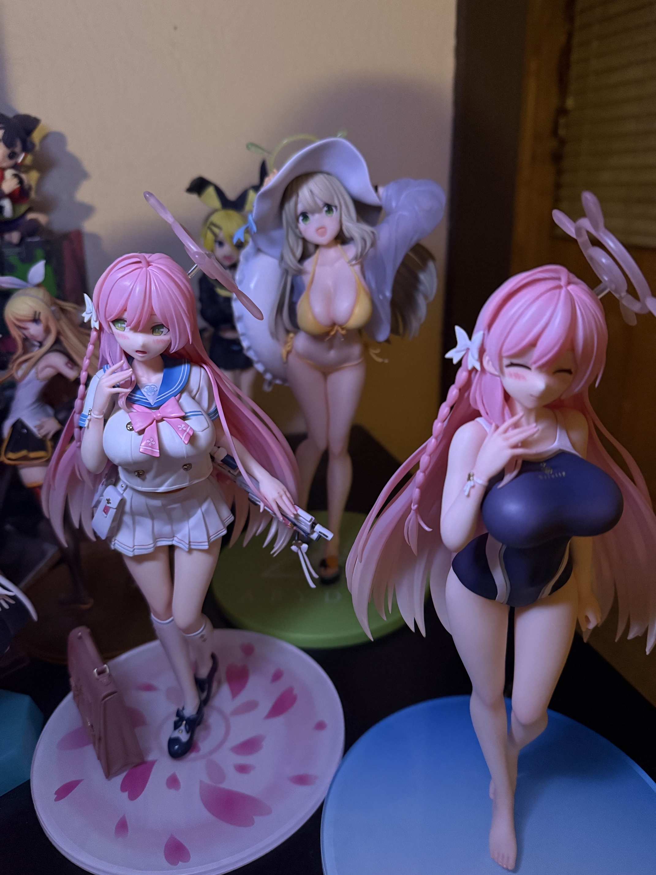 i had to re arrange my desk but whew these figgies are honestly really niceit's kinda hard to take a good photo esp at night (had to use my miku expo glowstick as ambient light) but i like them a lot. the hanako scale is especially amazing, she has pink shimapan AND underboob modeled under her shirti love it when sculptors add details like that even when you realistically won't see them 99% of the time