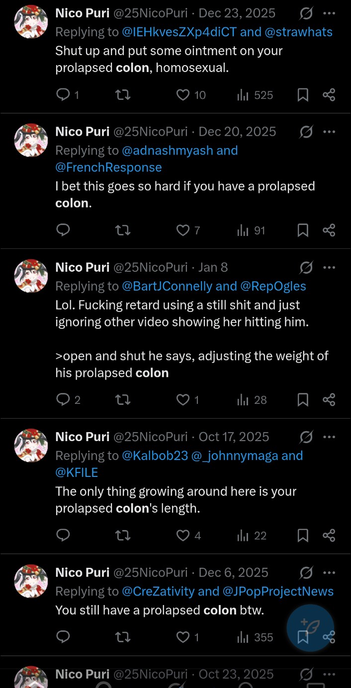 >meanwhile said anal bleeding fag (who may or may not be nico puri) is currently jacking off by the mere visual of the word thrown around constantly