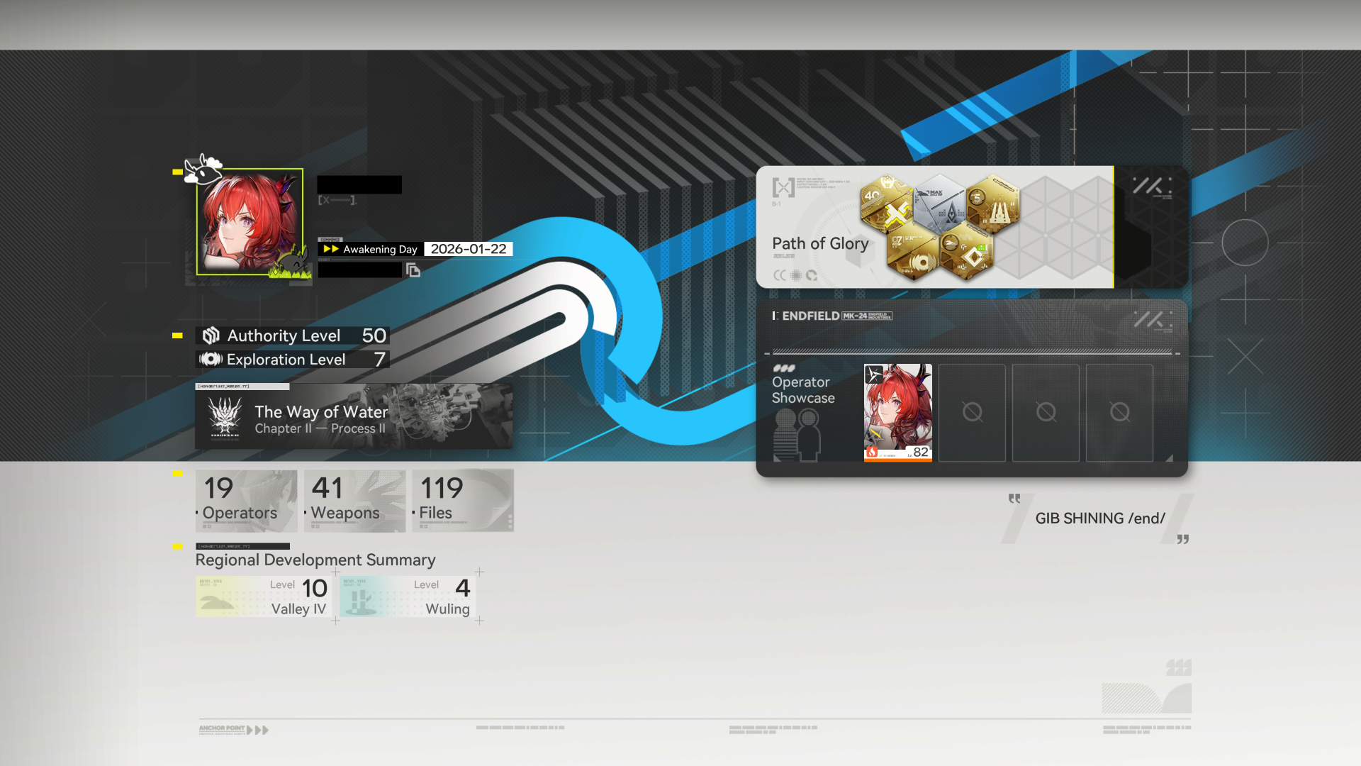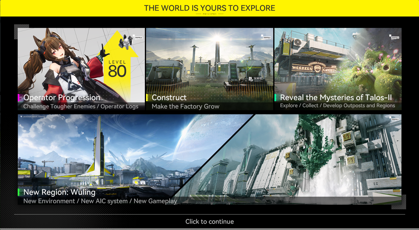 Previous thread: >>555088908>Official Websitehttps://endfield.gryphline.com/en-us>Official EN X (NEWS HERE)https://x.com/AKEndfield>Chartered Headhunting ScheduleJanuary 21st to February 7th --- "Scars of the Forge", (Laevatain)February 7th to February 24th --- "The Floaty Messenger", (Gilberta)February 24th to March 13th --- "Hues of Passion", (Yvonne)>Launch Reward Codes (Valid until January 29th)RETURNOFALLALLFIELDENDFIELDGIFTENDFIELD4PC>Voyage to the Stars (Ongoing until March 4th)https://endfield.gryphline.com/activity/voyage-to-the-stars/en-us/>Special Launch Streamhttps://www.youtube.com/watch?v=dz2g_D52NR0>Official Release Trailerhttps://www.youtube.com/watch?v=oJ00ggFb8A0>Official Release PV'shttps://www.youtube.com/watch?v=5Xm45NwWOlohttps://www.youtube.com/watch?v=UPpeeft1-8ohttps://www.youtube.com/watch?v=tN80M6IEMo0>Wikishttps://wiki.skport.com/endfield (Official)https://perlica.moehttps://warfarin.wiki/enhttps://endfield.wiki.gg/>Blueprint Guideshttps://talospioneers.com/en>Stickershttps://drive.google.com/drive/folders/13KH3L6QPIKkVH7pBddv4uxwmwJsnOtklhttps://drive.google.com/drive/folders/1OuVtjv1k-9c3M6n7d4PX3CGG5bkwH04ahttps://drive.google.com/drive/folders/1AStB8bzFk3lSwMwczWPkFYCBrZe0vHOghttps://drive.google.com/drive/folders/1yS0lqUhxf8tBRtpDFfCU1y16IS2sSeF7