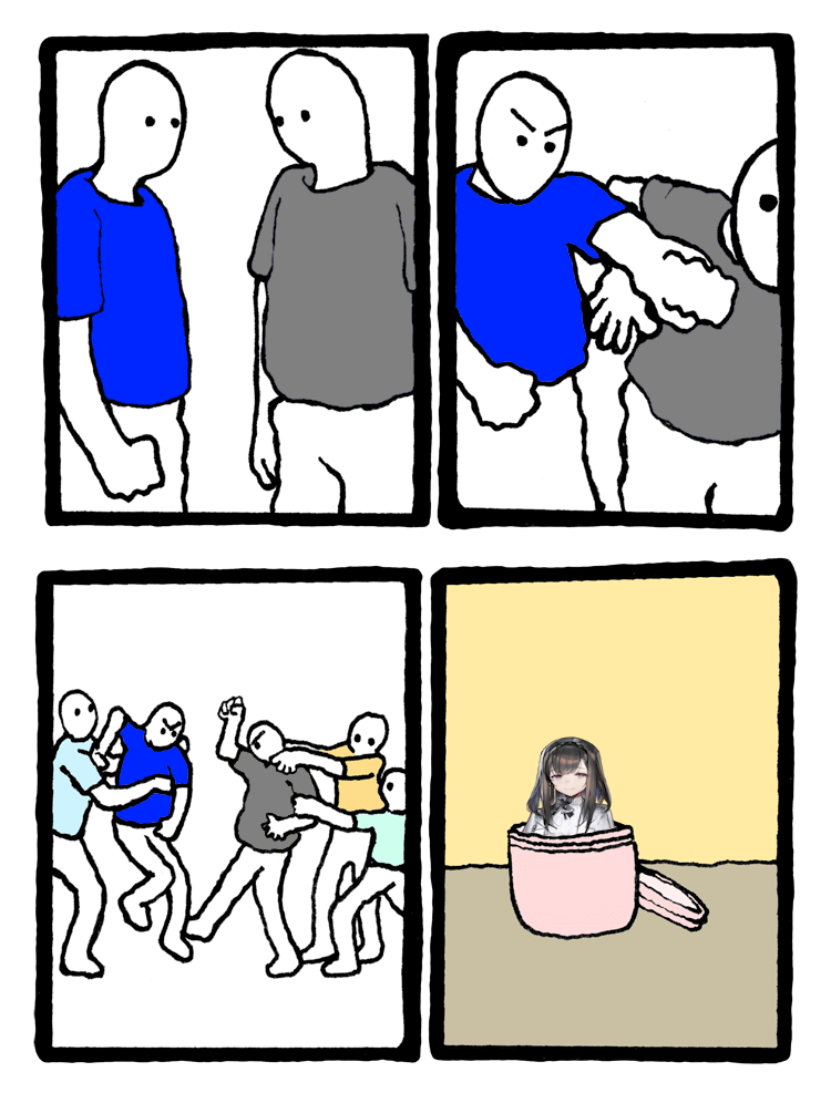 >dramatic cutscene>bunch of notice boards in the background saying "good job!"