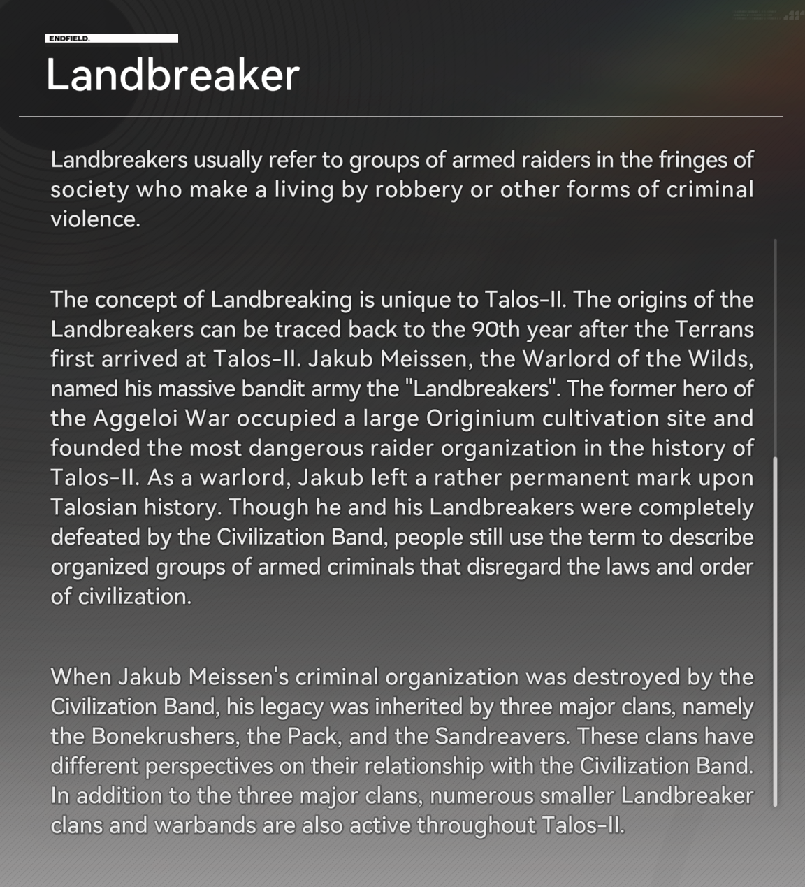 >>555125510The main story doesn't really make it clear at all, the main story glosses over so many of the details that it is completely valid that people don't understand the setting at all. Endfield Industries are supposed to be pioneers that lay the groundwork for venturing into the dangerous frontiers of Talos-II so that the rest of talosian society can follow suit, yet people just think they are some megacorp that owns everything while forcing originium down everyones throat (even though the game showcases multiple times that the cultivating of originium is mainly handled by the UWST and not Endfield)