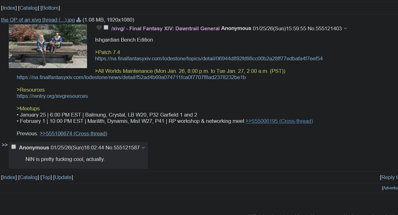 Ishgardian Bench Edition>Patch 7.4https://na.finalfantasyxiv.com/lodestone/topics/detail/06944d892fd98cc00b2a28ff77edbafa4f7eef54>All Worlds Maintenance (Mon Jan. 26, 8:00 p.m. to Tue Jan. 27, 2:00 a.m. (PST))https://na.finalfantasyxiv.com/lodestone/news/detail/f52ad4b69a074711fca0f7707f8ad2378232be1b>Resourceshttps://rentry.org/xivgresources>Meetups• January 25 | 6:00 PM EST | Balmung, Crystal, LB W20, P32 Garfield 1 and 2• February 1 | 10:00 PM EST | Marilith, Dynamis, Mist W27, P41 | RP workshop & networking meet >>555006195 Previous: >>555106674