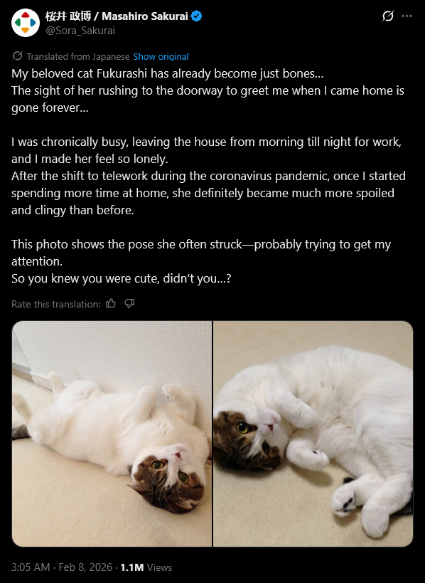 >>556697901Should've gotten another cat to keep them company while he worked 20 hours a day.