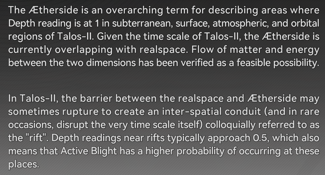 >>555134737>>555135008The Depth refers to a location's "proximity" to the AEtherside dimension. The closer to 1 the Depth is, the closer you are to the AEtherside dimension, where 1 is being in the AEtherside or the AEtherside overlapping with reality. They mention Depth offhandedly a few times in the story without really explaining, but they go more in depth in the archive files, hehe