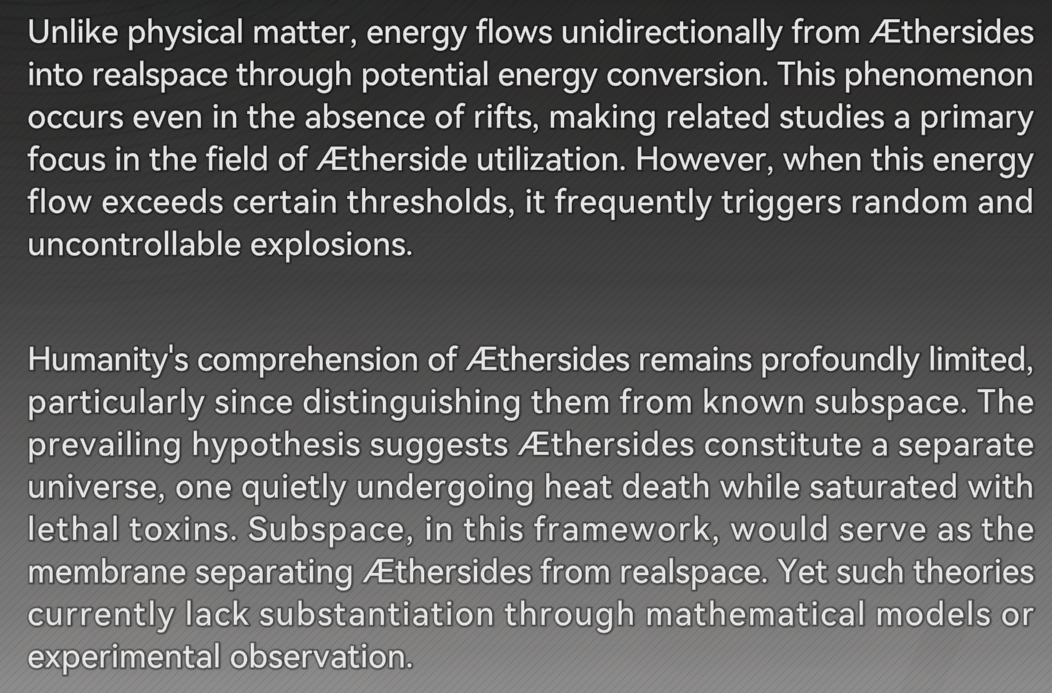 >>555136328I guess Talos-II has been stewing in the AEther for a while, for reasons yet to be explained? I assume it's why the Precursors built the AEthergate on Talos-II, and why Collapsal contamination only has a limited presence on the Terran side of the gate. I guess the veil between reality and the AEtherside is just particularly thin around Talos, and the energies have been leaking out for a long enough time to further thin the veil? And in other locations in the universe, the Depth reading would be 0.000...The AEther is clearly some kind of entropy, though. >>5551366050 depth would be absolutely zero contact with whatever the AEther dimension is, while 1 depth would be fully into the AEther dimension. AEtherside is just what they're calling the other dimension. You can't go further than 1, because 1 is fully inside the dimension.
