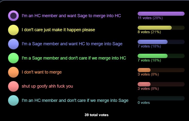 >>555142109>poll with 39 answers between 160 people>somehow means anythingMan you guys are all desperate losers trying to force shit every day here, if Sage merges into HC I'm out