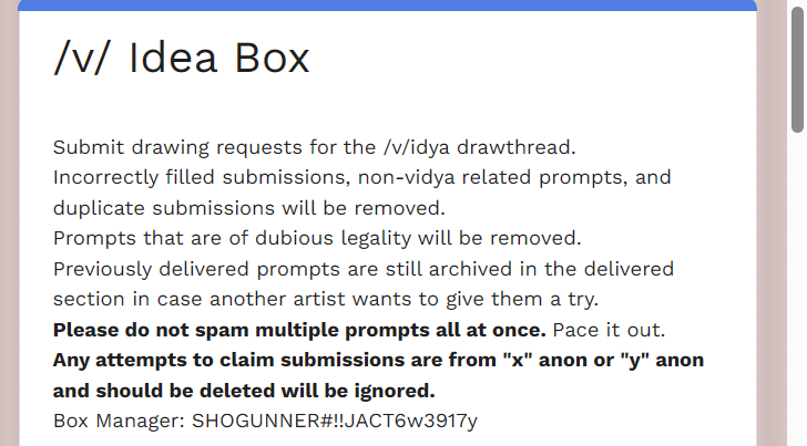>>555160662Reminding people of the new aspect of the box:Remember that when you make a submission, you now have to choose whether it was from /v/ or /vg/. If chosen incorrectly, the link to the post will be incorrect and your submission WILL be deleted. Thank you.