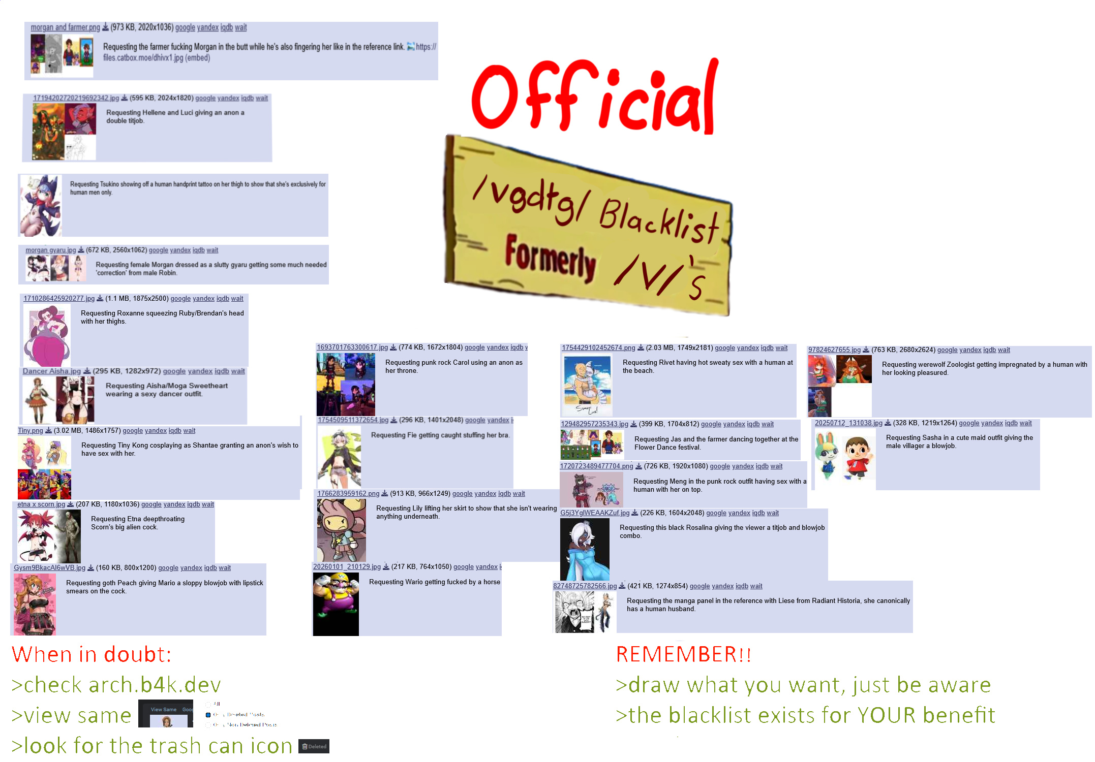 The Official /vg/ Drawthread black list for a ban evading spammer who already received multiple deliveries of similar requests and also caused the migration to /vg/. Artists be warned.CTR+F for requests on imgchest.https://imgchest.com/p/md7oaxwrlyp?vertical=1