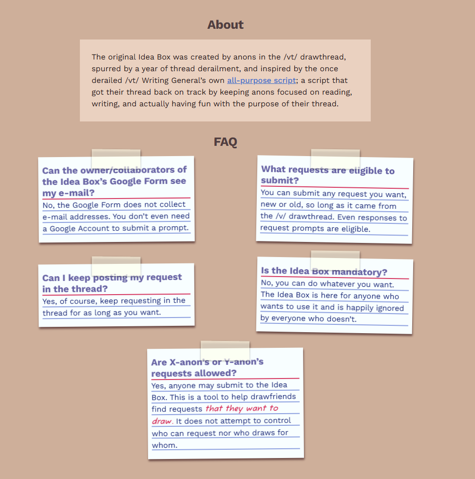 https://script.google.com/macros/s/AKfycbzQz_ocYcMpvGKD7HUyrc-YdftjOc9BRTfD8YFRxSARw9fdOcJYmutvUVnr86wUJn3nrA/execThe idea box is an optional way for people to make requests or get ideas for drawings.