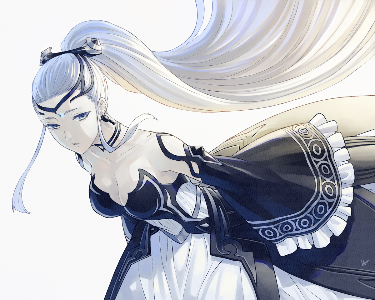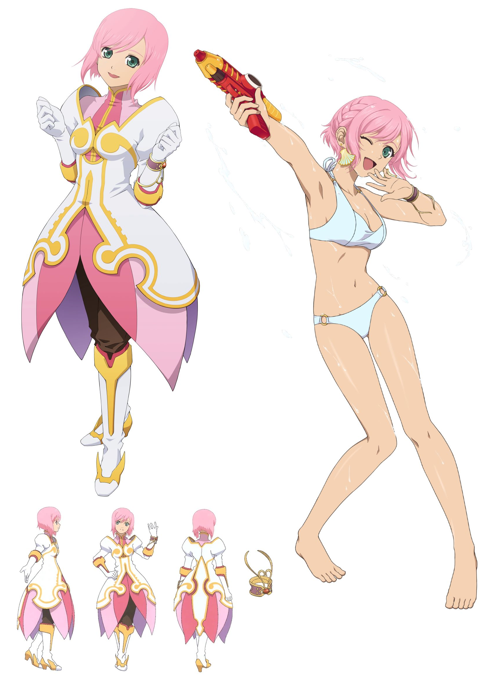 Requesting Estellise in her swimsuit shyly posing and showing her swimsuit, asking the viewer/Yuri how she looks. Perhaps with a bit of a sunset mood and her skin all glistening and wet from the sea breeze.