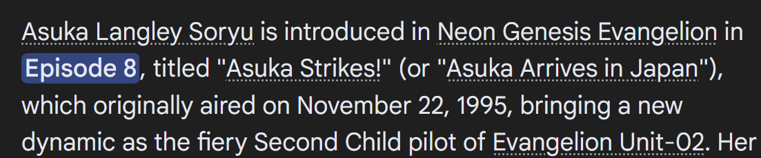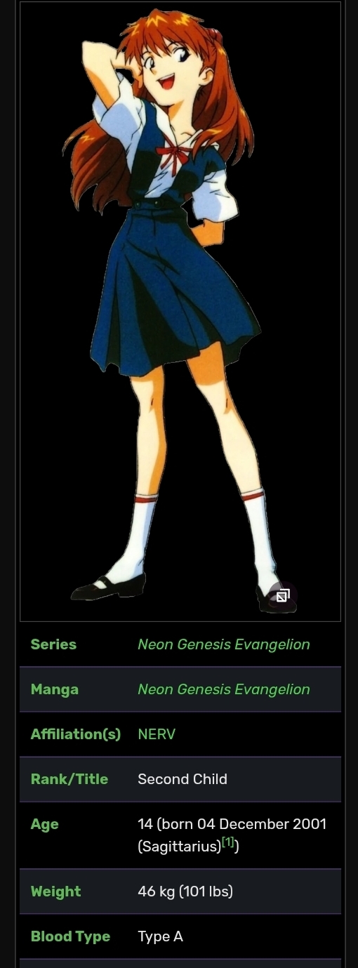 >>555635410she might actually be 31 or even 32 depending on when Hideaki Anno and Yoshiyuki Sadamoto first conceptualized/drew her