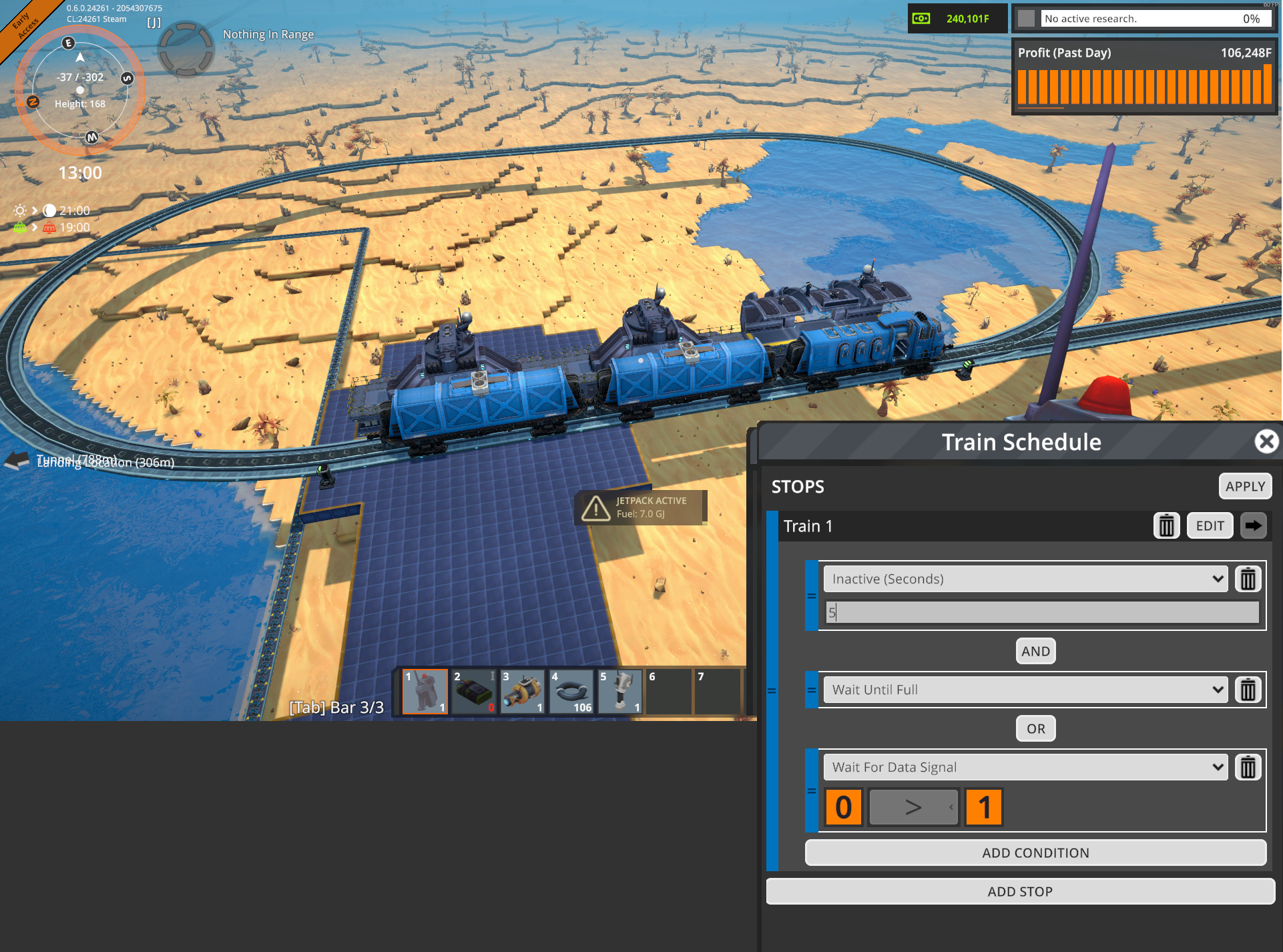 >>554728176Well trains are on the experimental branch of Foundry and holy fuck to they have a wide turning radius. Looks like rail signals/chain signals are in along with pic related for Scheduling. There's automatic track placement with click+drag (like factorio) or manual placement. Two fixed belt input and Two output per station. It's clearly still WIP with each part only requiring a single plate in the experimental branch. They also don't seem to take any energy/fuel kind of like elevators. I was really hoping they would transfer power like the trains in satisfactory do so I wouldn't have to also run power lines but oh well. Oh and thank fuck it auto-destroys terrain obstacles like trees when placing rail. Overall not bad.