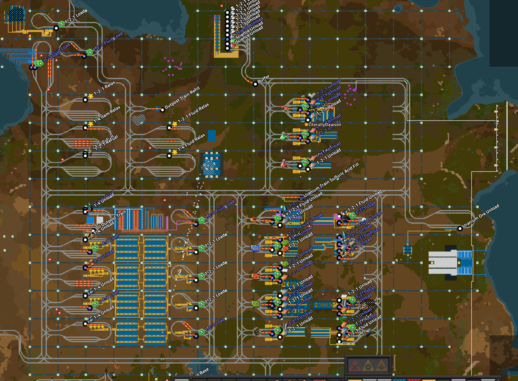 >>555333980The one thing I dislike about train bases is that the map ends up just being 90% dense rails everywhere, and 10% tiny pockets of production nestled in-between the massive rail interchangesAnd not even in a cool way because all Factorio trains are laughably tiny and there's no such thing as a shunting yard mechanic, so it's not even cool autistic trainyards, it's just soulless tramway paths taking up all the real estate with glorified pushcarts with a couple of wagons zooming around with ADHD