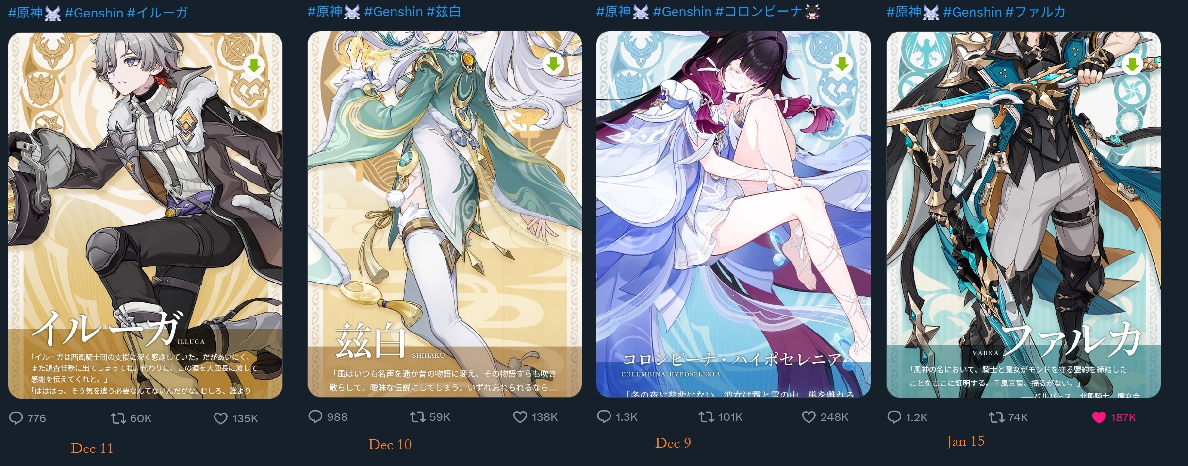 Previous: >>555155572 >Character Trailer - "Columbina: To Where She Flies"https://youtu.be/WsYsNoNjbaw (EN)https://youtu.be/9AVYsSZ1huA (JP) >Character Teaser - "Columbina: Where She Dwells"https://youtu.be/ME4OGvcPBUs (EN)https://youtu.be/7zLvIrPBGF4 (JP) >Version "Luna IV" "A Traveler on a Winter's Night" Trailerhttps://youtu.be/_yuHIzPJGHA (EN)https://youtu.be/wTL5hRtmWjM (JP) >Outfit Teaser: Teyvat Style – Nocturne of Serenityhttps://youtu.be/Q5I3xKJfIO4 (EN)https://youtu.be/TGsTYPeOtxw (JP) >Current character banner: Columbina, Ineffa, Ifa, Sethos, Fischl>Current weapon banner: Nocturne's Curtain Call (Catalyst), Fractured Halo (Polearm)https://www.hoyolab.com/article/43195155 >Daily check-in rewards (permanent)https://webstatic-sea.mihoyo.com/ys/event/signin-sea/index.html?act_id=e202102251931481&lang=en-us >Redeemable Codes with Primogems (all regions): https://genshin.mihoyo.com/en/giftGENSHINGIFT8X73KH58KDHNMoonInvitationLunaIV (NEW)P3GXX56W3VG9 >Useful Links (Wiki, Simulators, Maps, Character Builds, /gig/ friendlist, Third-Party Tools, etc.)https://rentry.org/giglinks /gig/ OP pastebin (use this if making new thread):https://pastebin.com/ca0zseQ9