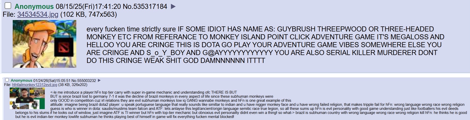 >>555357356>No, the game wasn't nearly this bad pre-2020according to what metric?>Don't try to gaslight about "oh DotA was always this way", it was NOT nearly this bad in the past.dont try and gaslight me by pretending its gotten worse when all you have is your dumb anecdotal evidence