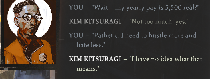 >>555181746>TQKim Kitsuragi, if he counts. If not, eeehhh, Mort?