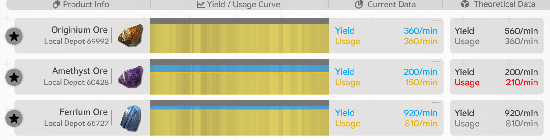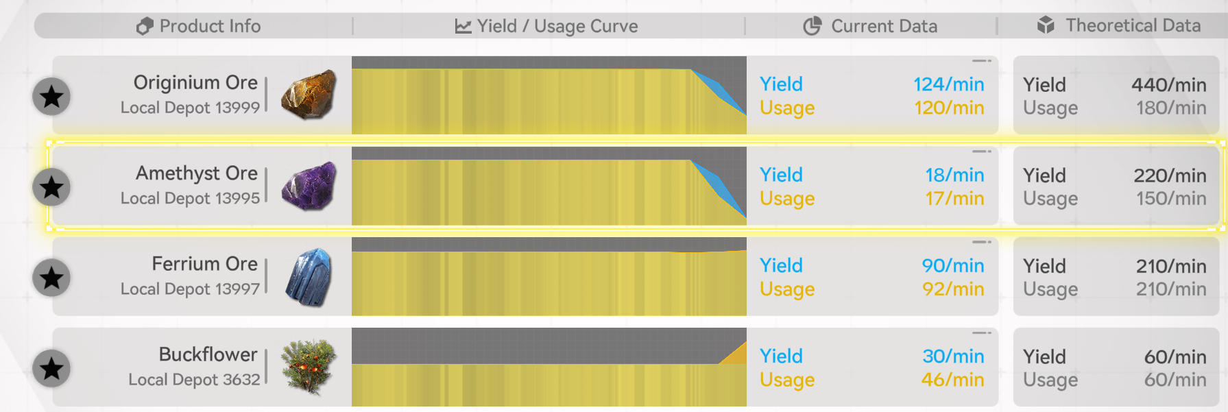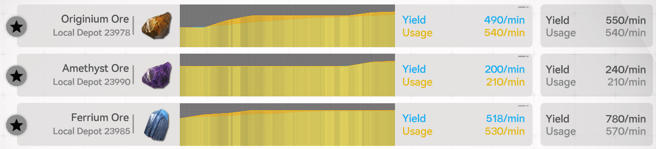 >>555186751Theoretical data is max output.You are capped at originium ore so the current yield reflects the consumption.You have mining rigs that can yield 440 ores per minute if you would have more space/consumption.