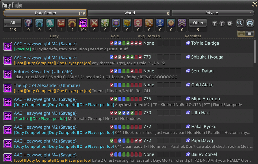 realistically how do I "catch up" and get clears this late into a tier? I want to get my alt ult to at least M11S and start reclearing for more loot and to play with people outside staticThere are barely any clear parties for M9 by this point, and you can imagine the quality of player when you do get a full group. Do I just have to keep sifting through the shit until I find a diamond?