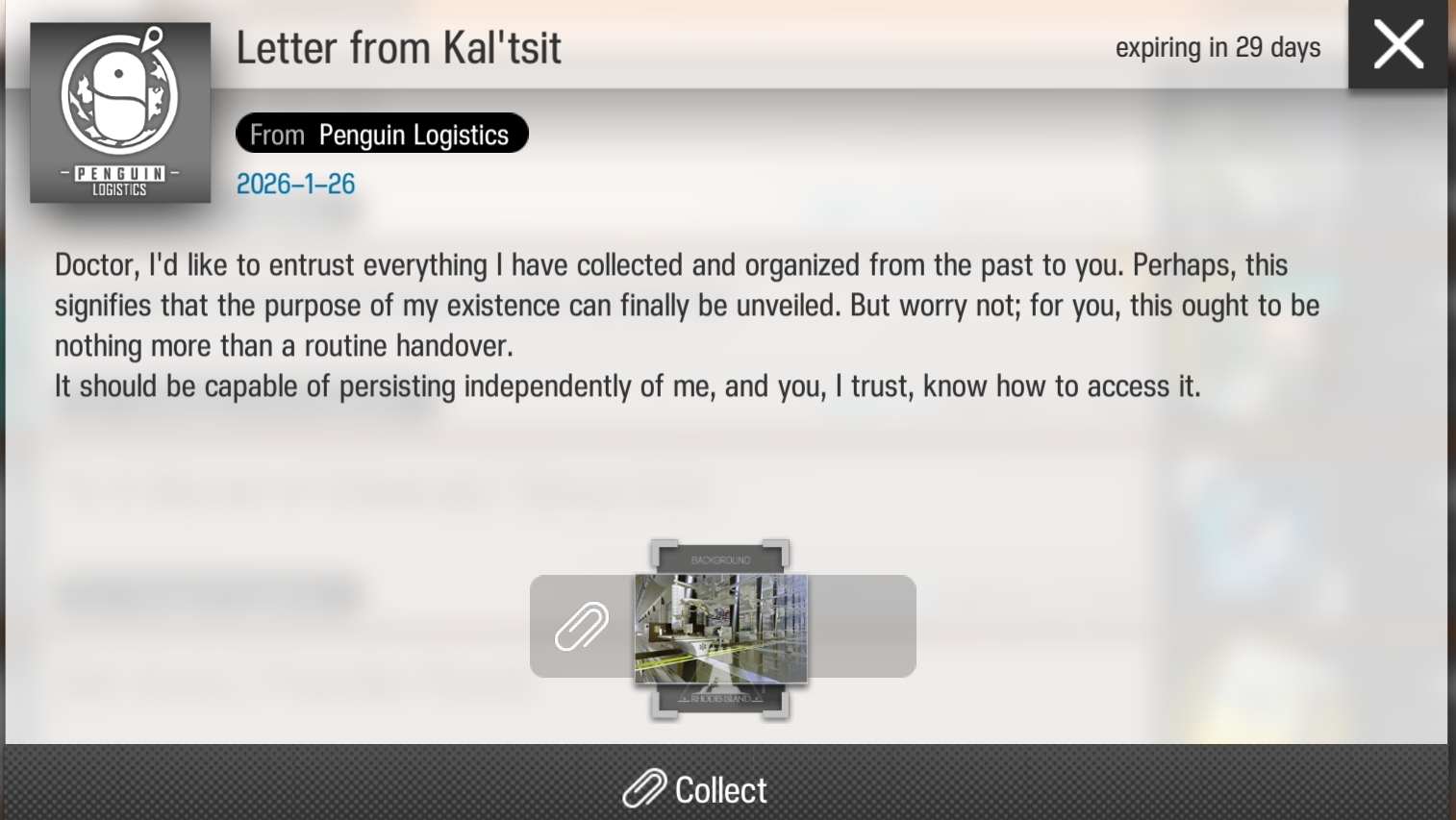 >>555249365>Lastly it also has the unlock card for the main menu background.Okay, between this and my birthday, I'm a little tired of getting melancholic ambiguously posthumous messages from Kal'tsit.