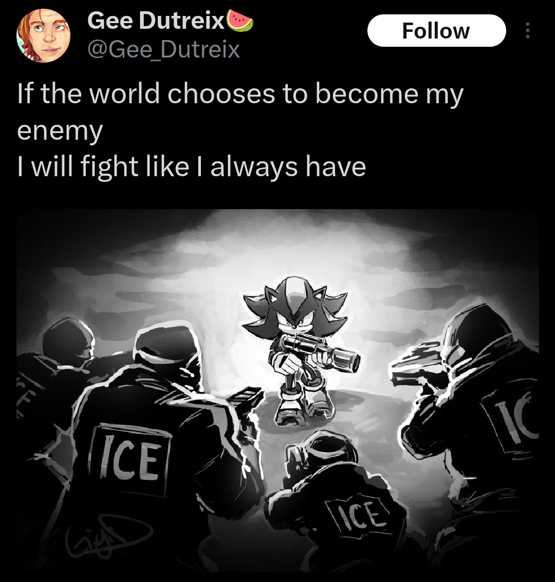 >>555277702The problem I have with this image is that Shadow is a Japanese creation from Sonic Adventure 2. And as we know from that game. Sonic should have simply hired a lawyer and gone to trial instead of running from the government. But SEGA does not understand how the American legal system works because they are Japanese. If this were the SatAM universe. Sally Acorn would have organized a proper resistance with strategic goals and a chain of command. She has the legs of a leader and the mind of a tactician. That is what makes her attractive to me personally.Shadow fighting ICE is good. But imagine if it were the Freedom Fighters. Antoine could use his military training. Bunnie has the raw firepower. And Sally. Sally would be wearing her vest and boots coordinating everything. That would be peak television.I rate this image 8 out of 10. It loses points because Shadow is holding the gun wrong and also because Ian Flynn probably likes
