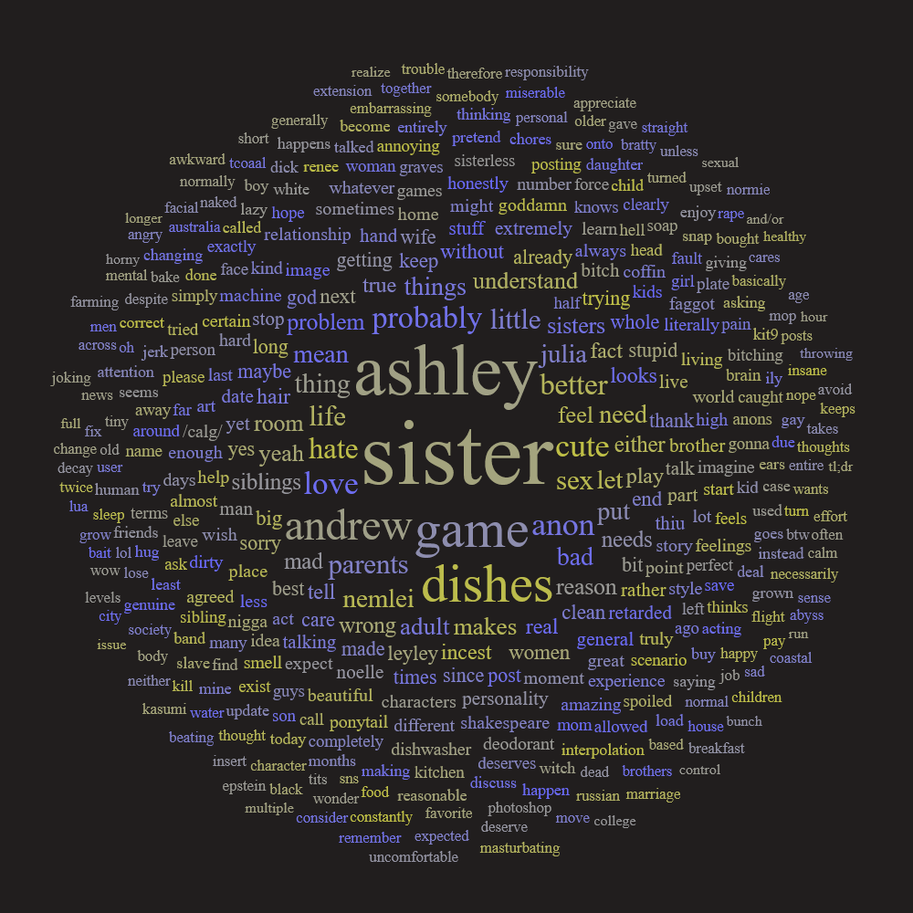 >>555258240In retrospect I think this is another nail in the coffin for Andrew's coping when even their mom is not even outright against them being weird like that. Like everyone but him sees the writing on the wall but he's sitting there covering his eyes and throwing anything he can to cover it up.I think if Andrew was privy to this conversation it might have created another arbitrary barrier like the incest rumours in highschool made him realize he wanted Ashley and then publicly swing wildly in the other direction to the detriment of everyone involved.