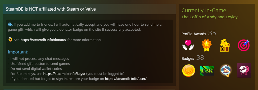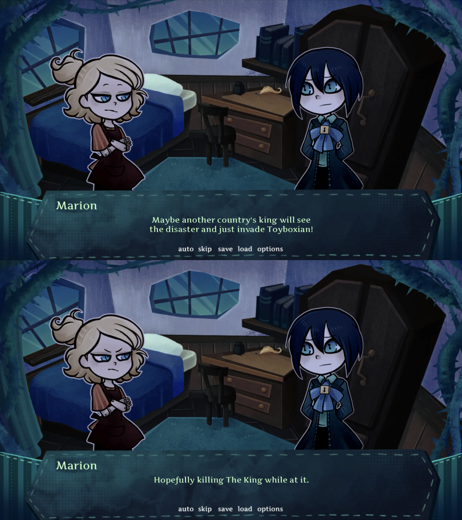 Australia Day Edition# Store link:https://store.steampowered.com/app/2378900/The_Coffin_of_Andy_and_Leyley/# Guides (Major spoilers; avoid until having played through the game once):>Routes & Subrouteshttps://steamcommunity.com/sharedfiles/filedetails/?id=3545926625>Achievementshttps://steamcommunity.com/sharedfiles/filedetails/?id=3050231198>Stars & Visionshttps://steamcommunity.com/sharedfiles/filedetails/?id=3459534675>Complete Episode 2 Walkthroughhttps://steamcommunity.com/sharedfiles/filedetails/?id=3052417644>Episode 3 Endings Guidehttps://steamcommunity.com/sharedfiles/filedetails/?id=3148380245# News:>Episode 3A: Decay has been released!https://store.steampowered.com/news/app/2378900?emclan=103582791473416093&emgid=523086940514289223>[DECEMBER] Next major episode update is still many months ahead, and development information will continue to be sparse due to spoilers. A few new images and a new cutscene have been shared.https://store.steampowered.com/news/app/2378900/view/496087542571991439# Nemlei's previous games:https://mega.nz/file/FSFXURYI#FhEp5w4qMv4w0A0mMfQ4YqLD5TJuve014_-eTNdIbSIPrevious thread: >>554904109