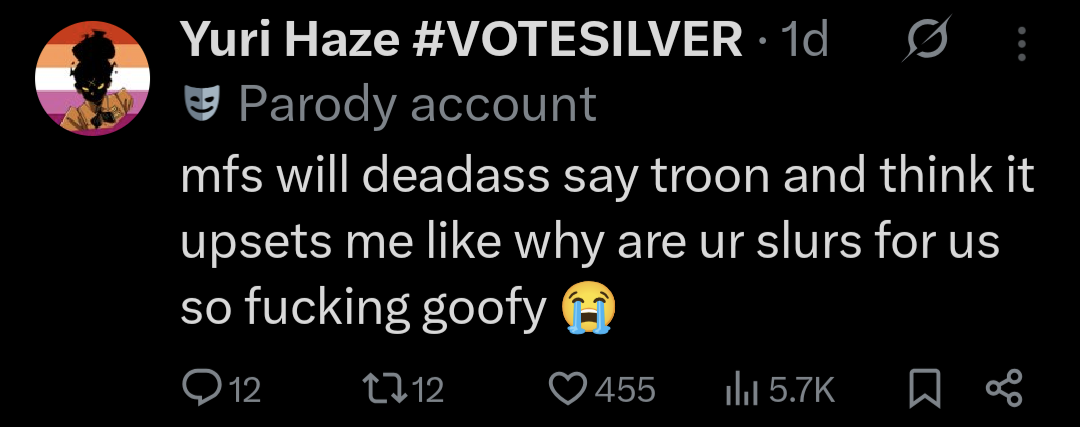 >>555265165literally all the online discourse ive seen of her was "transbians" creaming themselves to how silver's a lesboeven the furries dont talk about her this much, its all fucking trannies