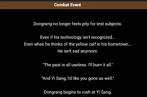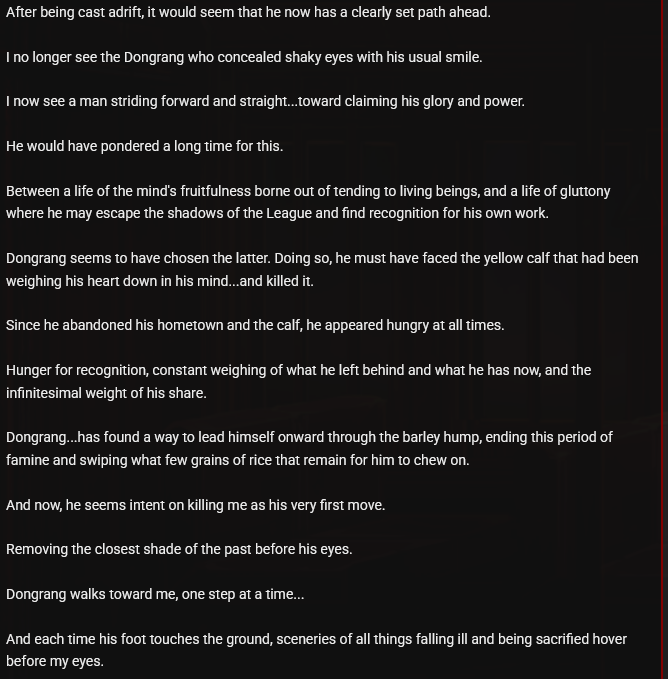 >>555287936It is the observation log but I think you'd have to beat Dongrang and then fight him again for the observation log to be viewablePM really needs to make a bestiary where we can view all the enemies and observation logs in one place, I think it'd also be neat if they color coded the text based on which sinner is writing it, not that it's difficult to tell when Don Quixote or Rodion interjects into someone else's observation log I just think it'd be neat