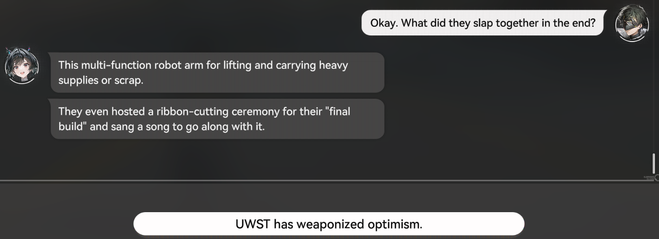 >>555297759It's an assumed choice, I think.It takes one hour to complete the first transfer of ressources between Valley IV and Wulan.So they tried to keep us occupied for one hour in an organic way.It's a failure, obviously.But at least they tried.