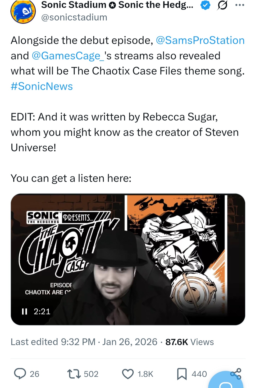 Welcome to the Sonic General! Here we discuss all things Sonic!/sthg/ #9011 - Sleepy Mascots Edition==NEWS==>Sonic the Hedgehog's 35th anniversaryhttps://www.sega.com/sonic-the-hedgehog?tab=35th-anniversary>Sonic the Hedgehog 4 to release on March 19, 2027https://variety.com/2025/film/news/sonic-4-release-date-march-2027-1236280697/>Paramount Developing Sonic Movie Spin-Offshttps://comicbook.com/gaming/news/sonic-the-hedgehog-spin-off-movies-report-paramount/==Comic Release Dates==Sonic the Hedgehog #84 - 04 February 2026Sonic the Hedgehog: Sonic Racing: CrossWorlds - 04 March 2026Sonic the Hedgehog #85 - 11 March 2026Sonic the Hedgehog #86 - 01 April 2026==GENERAL INTEREST LINKS==https://rentry.org/sthglinks>Milestone pastebin:https://pastebin.com/LJCfZhY4>Sonic Game/Mod Recommendation Spreadsheet:https://rentry.org/sthglinks#sonic-gamemod-recommendation-spreadsheet>Perfect System Collection:https://rentry.org/sthglinks#perfect-system-collection>Sonic comic scans:https://rentry.org/sthglinks#comics>Sonic shows:https://rentry.org/sthglinks#shows>SAGEhttps://sagexpo.org/>SHChttps://shc.zone/>#10000 Projecthttps://pastebin.com/Fb8Bt4ru>/sthg/ booru:https://sthg.booru.org/>/sthg/ OC info:https://sthgoc.tumblr.com/archive/>/sthg/ CyTube:https://cytube/r/sthg>/sthg/ Pixel World:https://ourworldofpixels.com/sthgPrevious Zone: >>555279624Thread theme: https://www.youtube.com/watch?v=MlZOFIRC9HA
