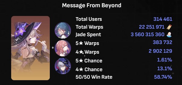 It would be 80 average if i took 58/42 from the screen instead of 50/50, but lets assume it's a bias of some losers not uploading their loser accounts (there is a 50/50 pity like in 5.0+ genshin).