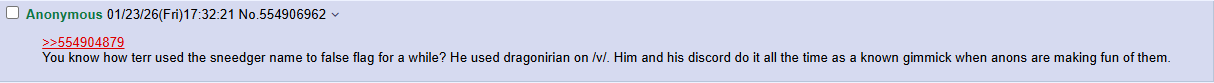 >>555342894in a perfect world both of their respective shitholes would be range banned but naturally we can’t have that>>555342954terr was here and shitting things up for a while before release but dragonirianfag is a new thing that popped up with NR yeah