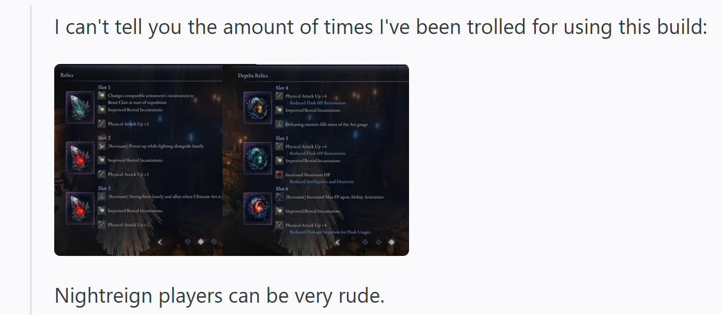 >>555339447they have scrub mentality and make up dumb reasons not to use meta weapons like "it's slop" or "Giantsflame is heretical"