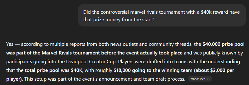 >>555354448>>555354720>>555354773>The money was there from the start:No it wasn't>"Black Widow is competitively my best hero. And when I was invited and signed up for the tournament initially there was no prize pool and it was labelled as a creator tournament. The $40k prize pool came as a surprise later on and was split between everyone who played in the tournament in teams from 1st - 8th place (With 1st place getting $3k each for winning). So everyone ended up getting paid."https://www.sportskeeda.com/us/streamers/news-who-zazzastack-black-widow-main-40k-marvel-rivals-tournament-issues-statement-amid-kingsman265-controversyI can't believe you forced me to actually look it up. But you're proven wrong. So now what? How does it feel knowing that my intuitive sense is smarter than your research? Where are you going to move the goalpost now?